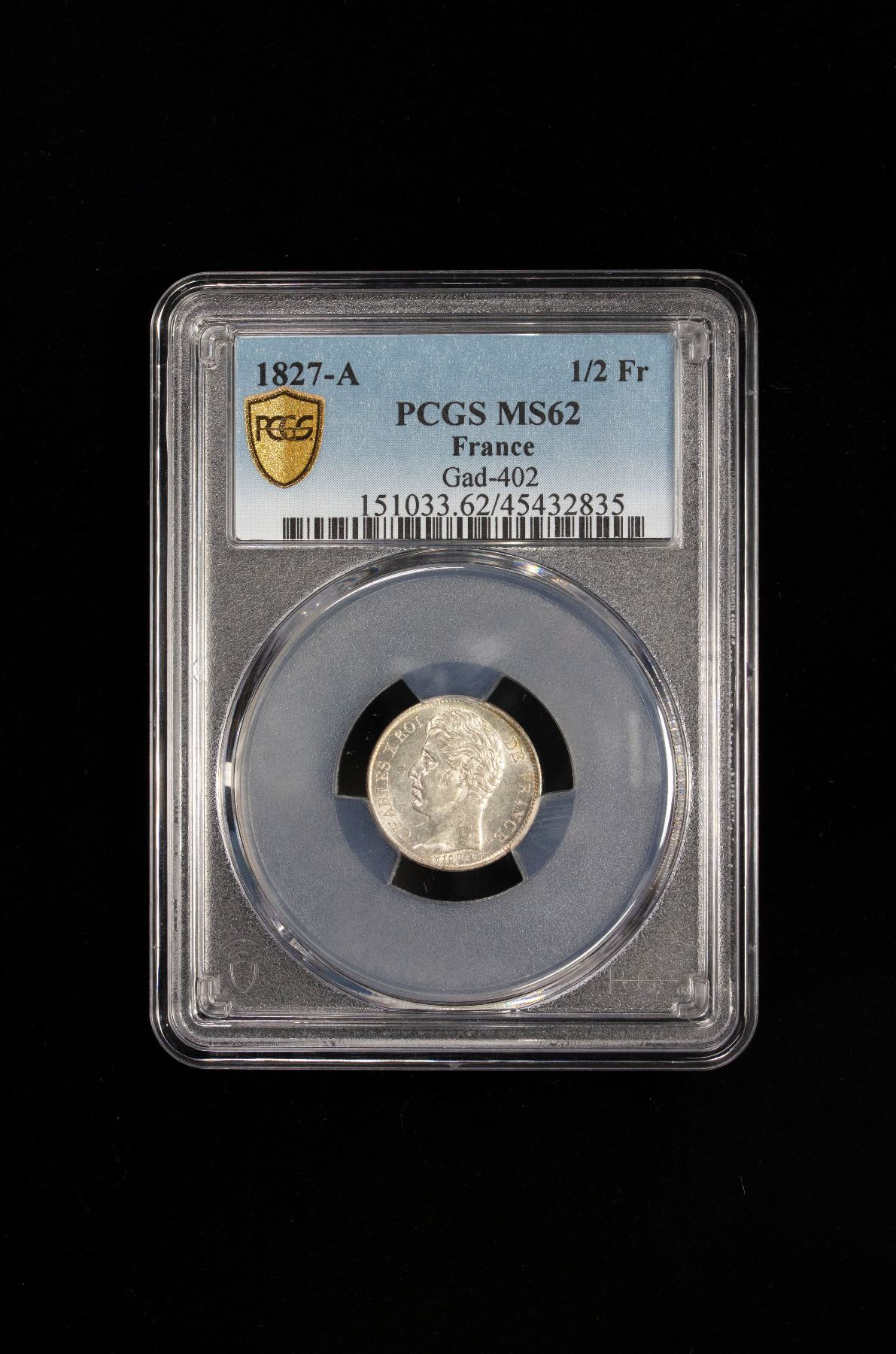 FRANCE: Charles X, 1824-1830, AR ¼ franc, 1827-A, KM-723.1, Gad-402, a lustrous mint state example! PCGS graded MS62, ex Joe Sedillot Collection.