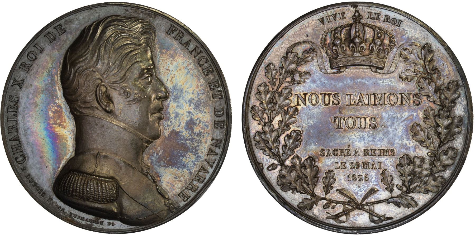 FRANCE: Charles X, 1824-1830, AR medal (41.18g), 1825, Sombart-108, 42mm silver medal on the Coronation of Charles X in Reims by Dubois, bust right with CHARLES X ROI DE - FRANCE ET DE NAVARRE around // VIVE - LE ROI at top above crown with "NOUS L'AIMONS / TOUS / SACRÉ A REIMS / LE 29 MAI / 1825" below, all within oak wreath, lightly cleaned, small rim bump at 4:30, has retoned nicely, semi-prooflike, very rare, plain edge, Choice AU. In researching this piece, we were not able to locate any other examples in silver, finding only a few in bronze.