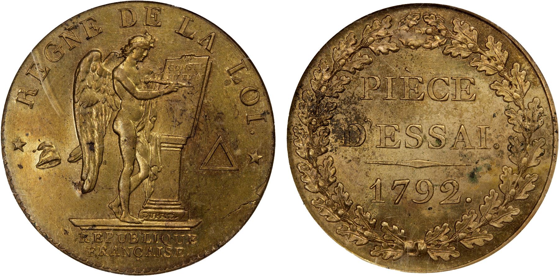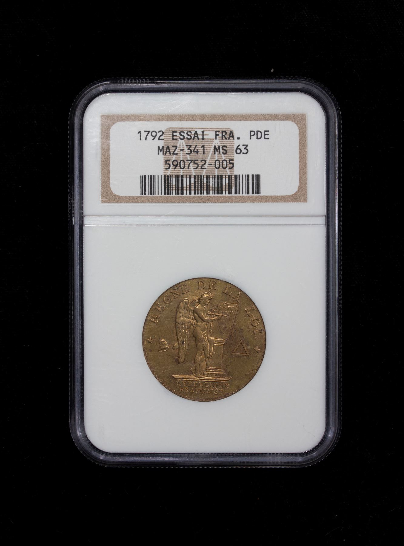 FRANCE: Constituency, pièce d'essai, 1792, Mazard-340var, 27mm pièce d'essai in bell metal, Winged Genius standing right inscribing tablet with the Constitution, with REGNI DE LA LOI. above, cap and star to left, triangle and star to right, and REPUBLIQUE FRANÇAISE in exergue // PIÈCE / D'ESSAI / 1792. with oak wreath around, quite lustrous, varies from Mazard-340 in the 1792 date, label erroneously reads MAZ-341, in old NGC slab, plain edge, NGC graded MS63, R1 (Mazard). This variety seems to be much scarcer than Mazard-341. The few specimens we have found have all been dated 1792, so Mazard may have gotten the date wrong. Mazard-341 appears to be found for both dates, 1792 and 1793.