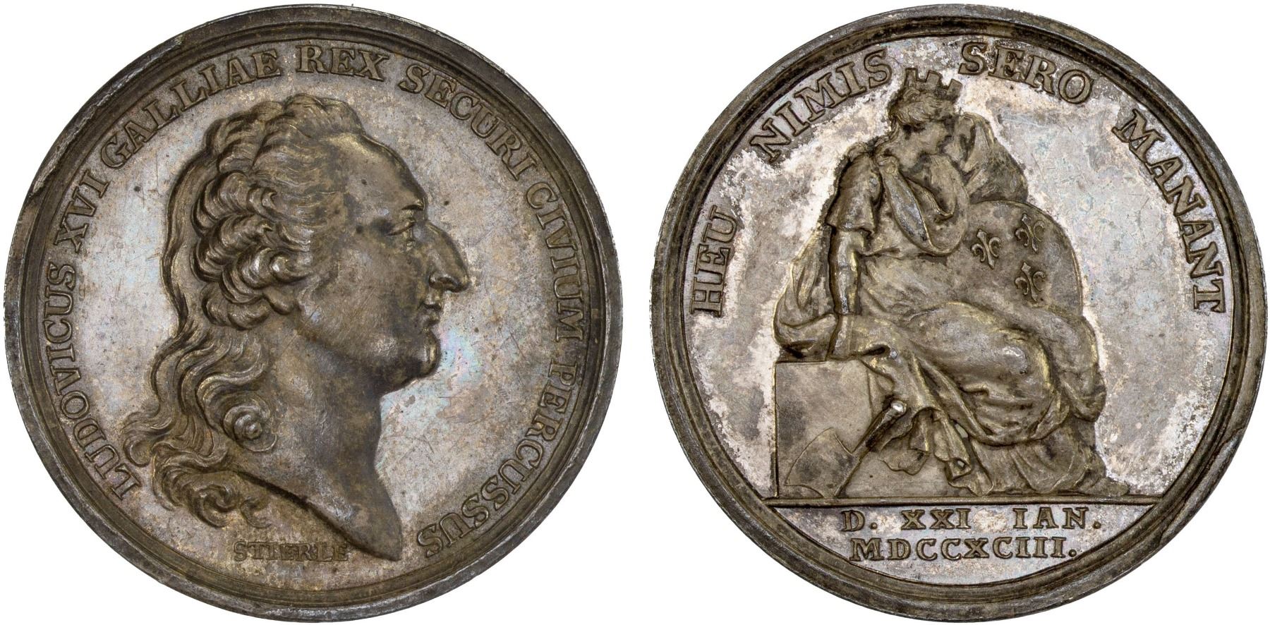 FRANCE: Convention, AR medal (13.91g), 1793, Julius Coll.-267, Hennin-473, 34mm silver medal on the Execution of King Louis XVI on January 21 by J. J. G. Stierle, bust right with LUDOVICUS XVI GALLIAE REX SECURI CIVIUM PERCUSSUS around // mourning city goddess of Paris seated right with fleur-de-lis shield behind and executioner's axe at her feet, with HEU NIMIS SERO MANANT around and D. XXI IAN. / MDCCXCIII. in exergue, obverse rim cud, toned, plain edge, Choice XF. In researching this piece, we were not able to locate any other examples in silver, finding only a few in bronze.