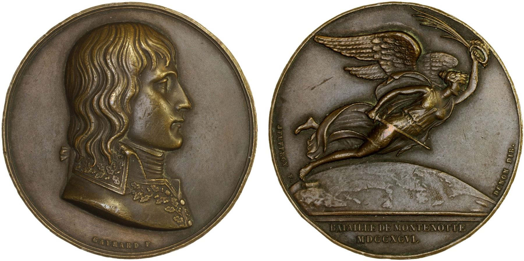 FRANCE: Directory, AE medal (35.64g), Paris, 1796, Zeitz-1, Julius-491, 40mm bronze medal on the Battle of Montenotte by R. Gayrard and R. V. Jeuffroy, uniformed bust of Napoleon right // Victory flying right with palm branch, wreath, and sword with globe of world below and BATAILLE DE MONTENOTTE / MDCCXCVI in exergue, very high relief, restrike, BRONZE with cornucopia privy mark on edge, XF.