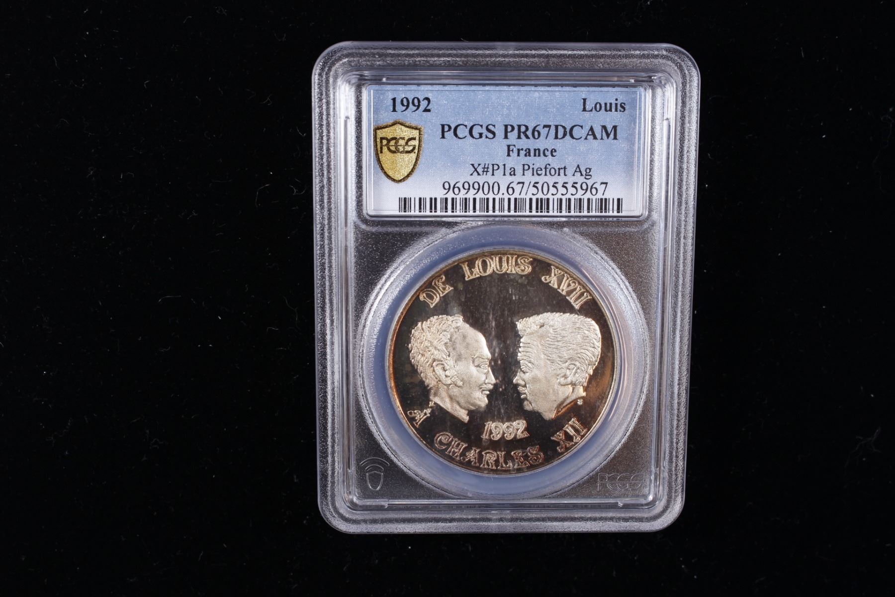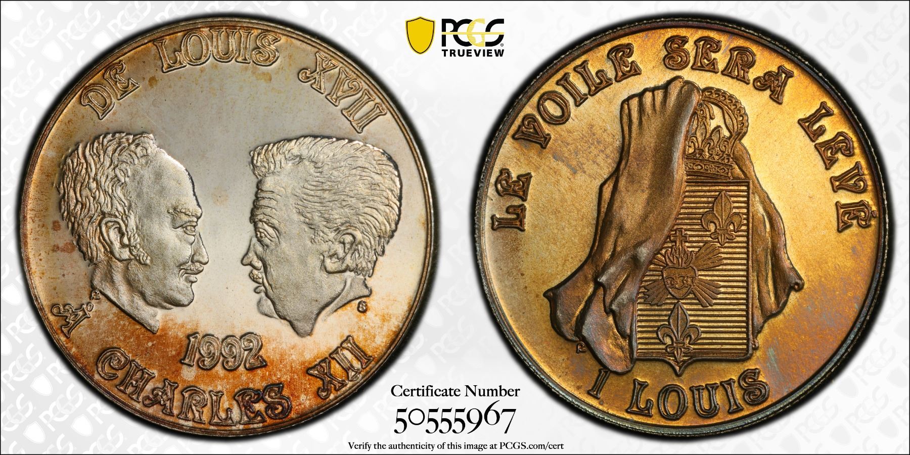 FRANCE: Fantasy Issues, AR louis, 1992, KM-XP1a, fantasy pretender piedfort (piéfort) issue in silver for Charles XIII of the House of Bourbon, PCGS graded Proof 67 DCAM. Fantasy type struck at the Maison de Frappe FDC, a private mint in Quebec, by Serge Huard. Charles Louis Edmond de Bourbon (June 18, 1929 – December 21, 2008), known as Count of Poitiers then Charles XII. He married Jacqueline Brun (1930-1982) in 1951, then married Renée Divoux in 1986.