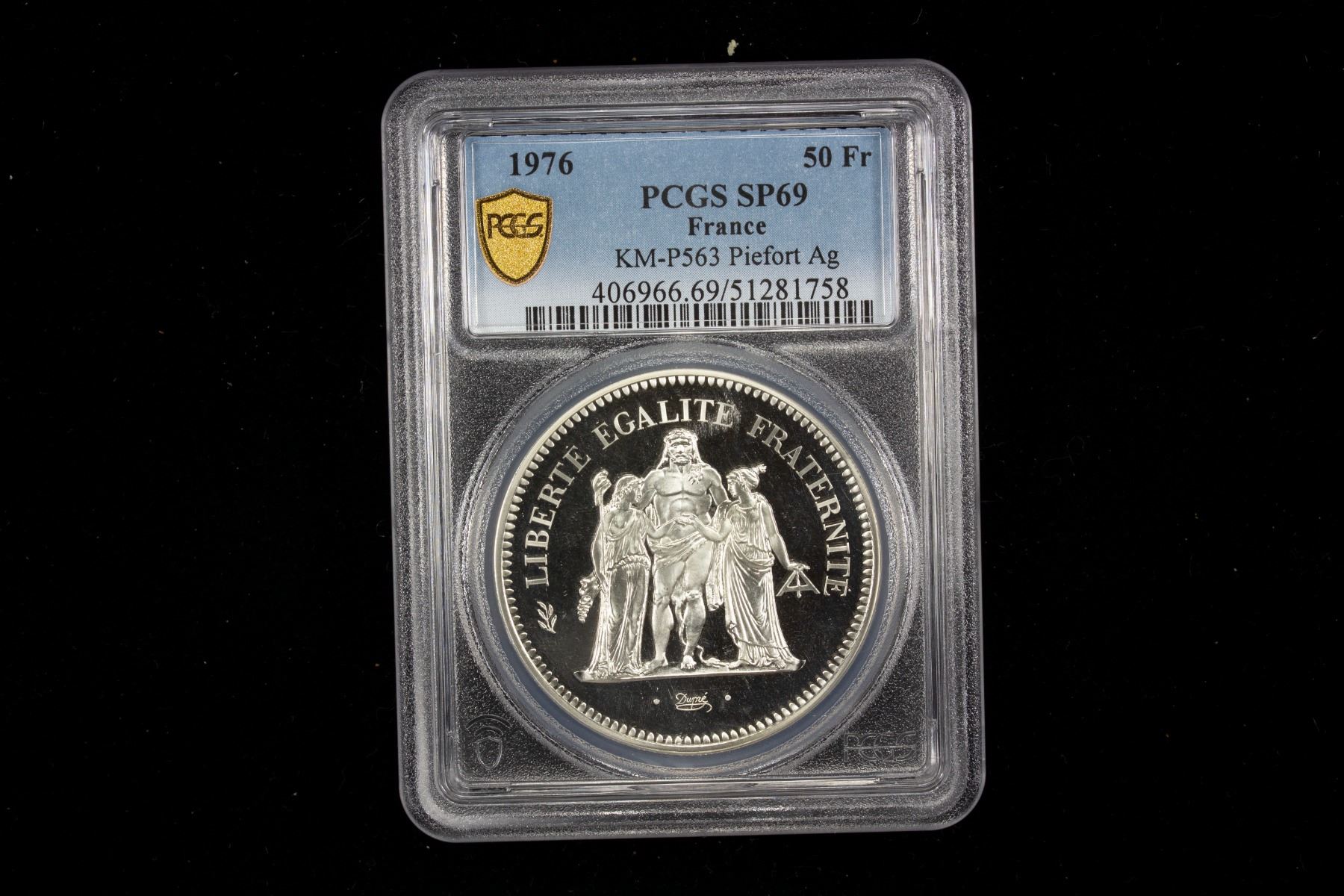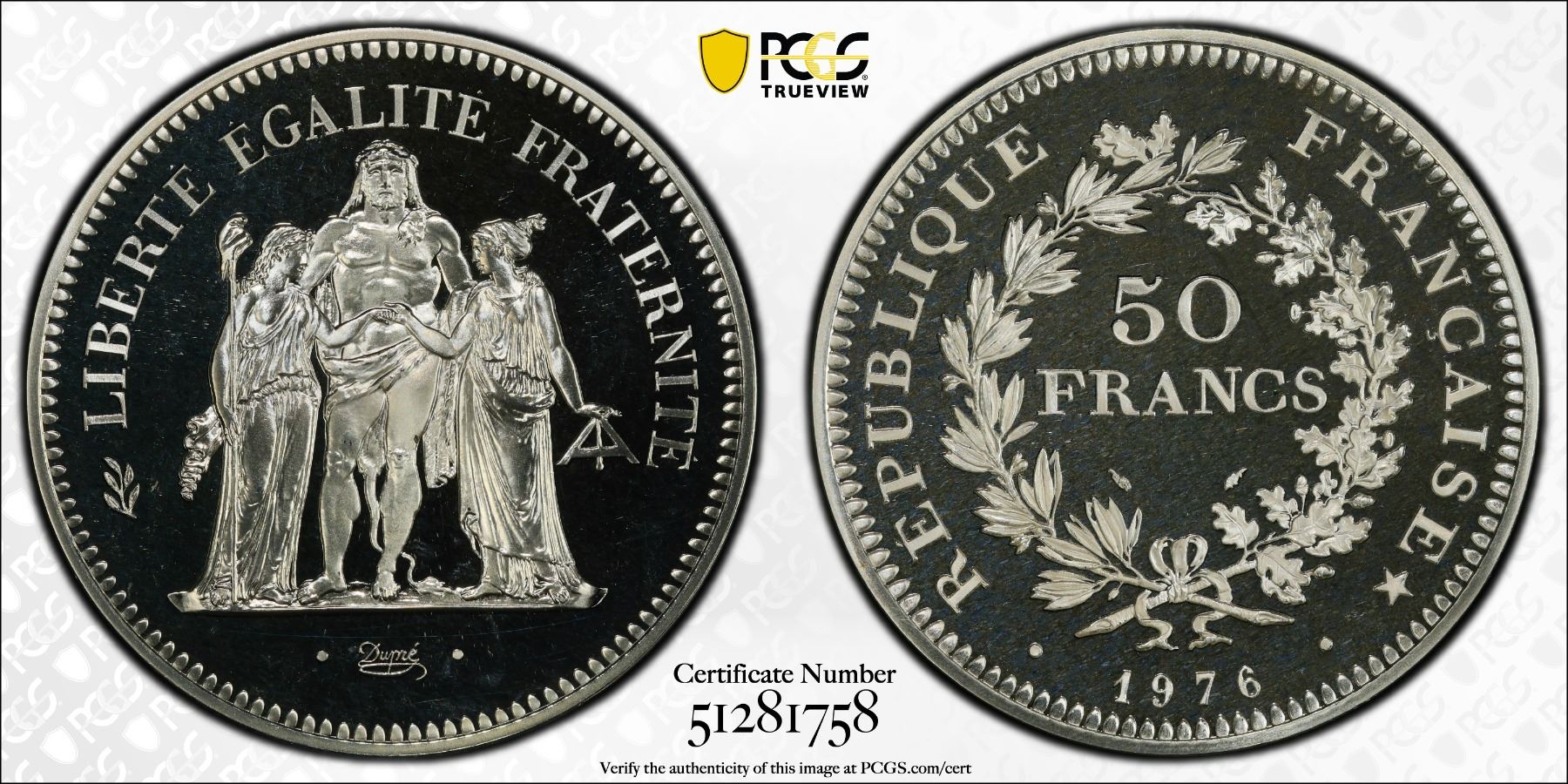 FRANCE: Fifth Republic, AR 50 francs, 1976, KM-P563, piedfort (piéfort) issue, mintage of 213 pieces, rare, in original Monnaie de Paris plastic pack, PCGS graded Specimen 69.
