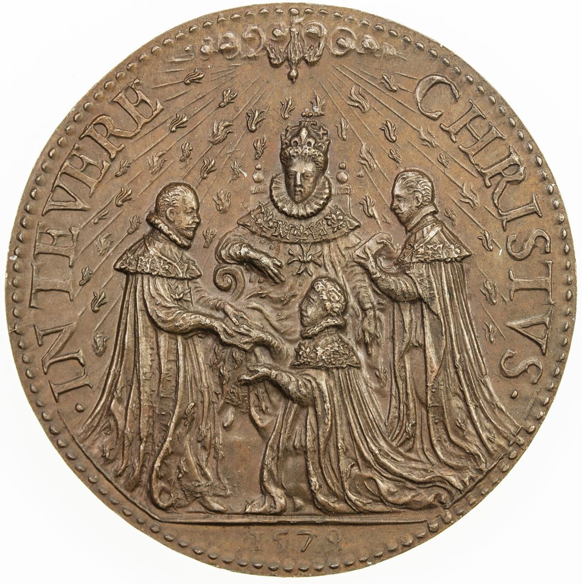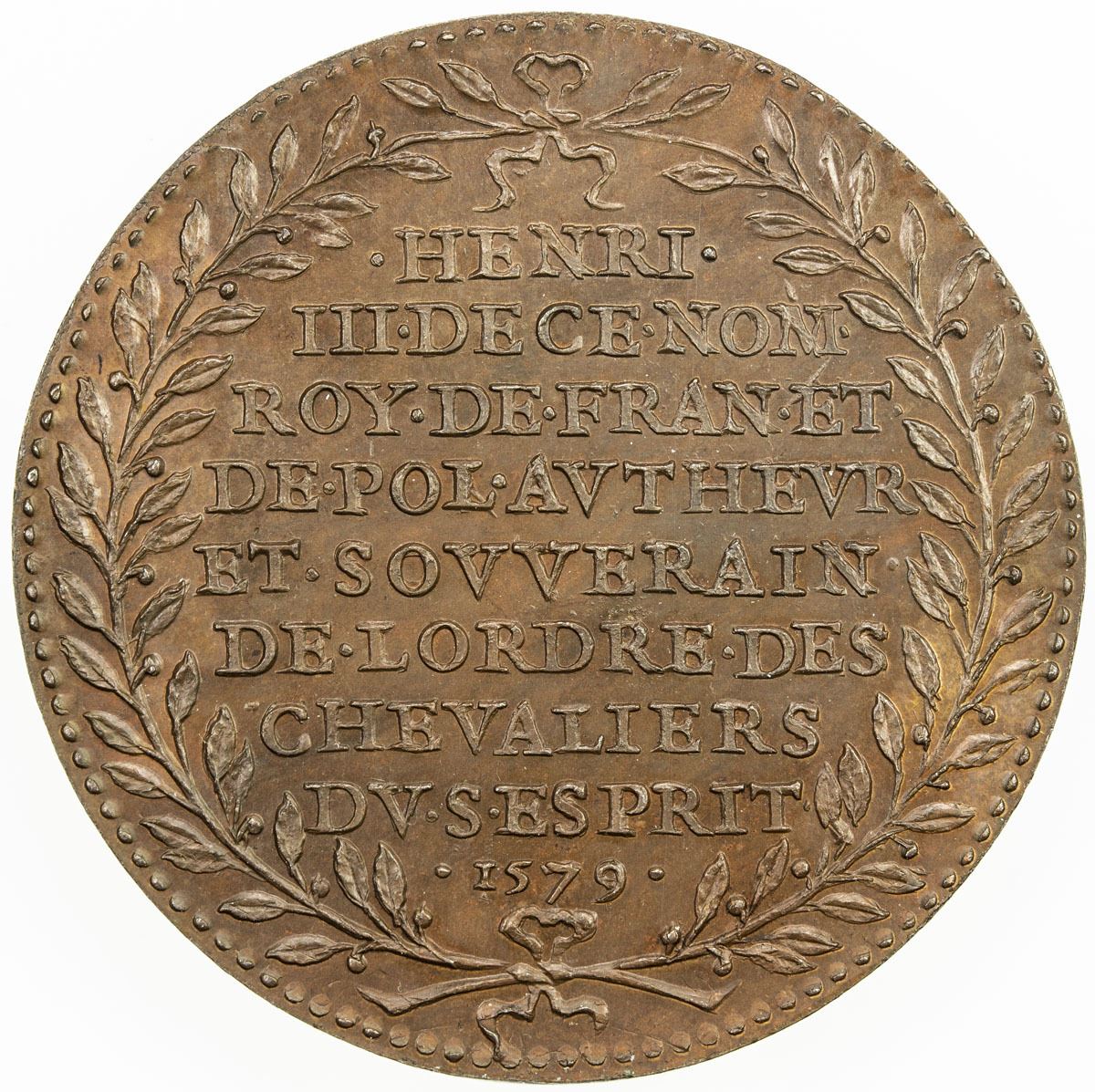 FRANCE: Henri III, 1574-1589, AE medal (33.40g), 1579, 41mm bronze medal for the Order of the Holy Spirit, Henri III seated facing on throne wearing robe and the Order of the Holy Spirit with radiant dove above, and receiving oath of a new knight, kneeling between the provost and the Grand Treasurer, with tongues of fire in the field and IN TEVERE - CHRISTVS around and date in exergue // HENRI / III DE CE NOM / ROY DE FRAN ET / DE POL AVTHEVR / ET SOVVERAIN / DE LORDRE DES / CHEVALIERS / DV S ESPRIT / 1579 within laurel wreath, brown, plain edge, Choice AU.