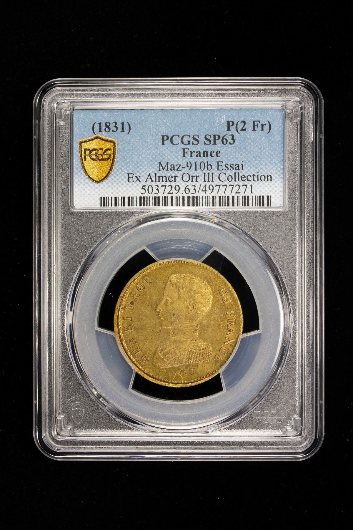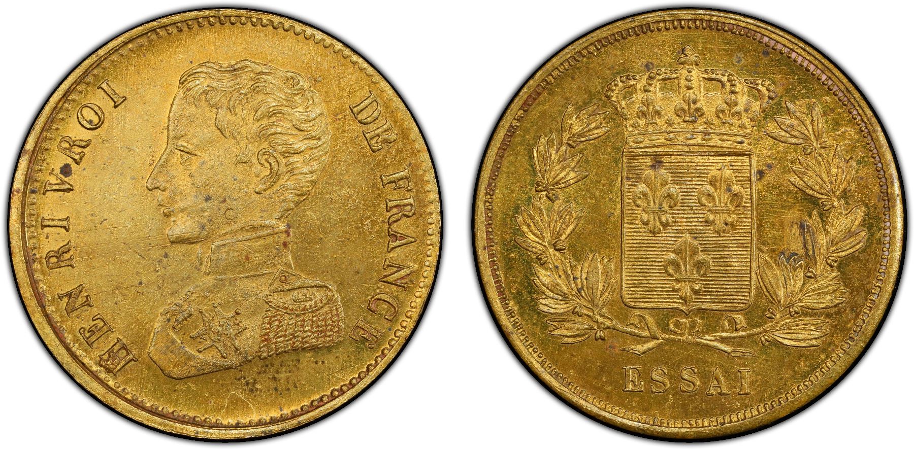 FRANCE: Henri V, Pretender, 1830-1883, AE 2 francs, ND (1830), KM-PTE30a, Maz-910b, ESSAI in bronze struck at the Brussels Mint, a lovely specimen quality example! PCGS graded Specimen 63, ex Almer Orr III Collection. Henri, Count of Chambord, was disputedly King of France from August 2-9, 1830 as Henri V, although he was never officially proclaimed as such. Afterwards, he was the Legitimist pretender to the throne of France from 1844 to 1883. He was nearly received as king in 1871 and 1873.