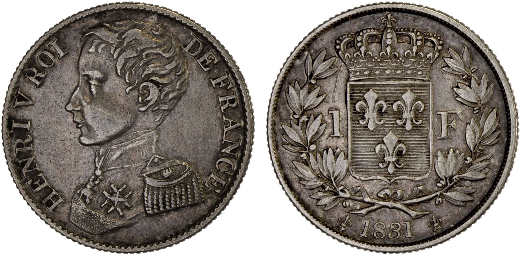 FRANCE: Henri V, Pretender, 1830-1883, AR franc, 1831, KM-X28.2, Gad-451, Maz-911, XF. Prince Henri, Count of Chambord and Duke of Bordeaux, was disputedly King of France from 2 to 9 August 1830 as Henry V, although he was never officially proclaimed as such. Afterwards, he was the Legitimist pretender to the throne of France from 1844 until his death in 1883.