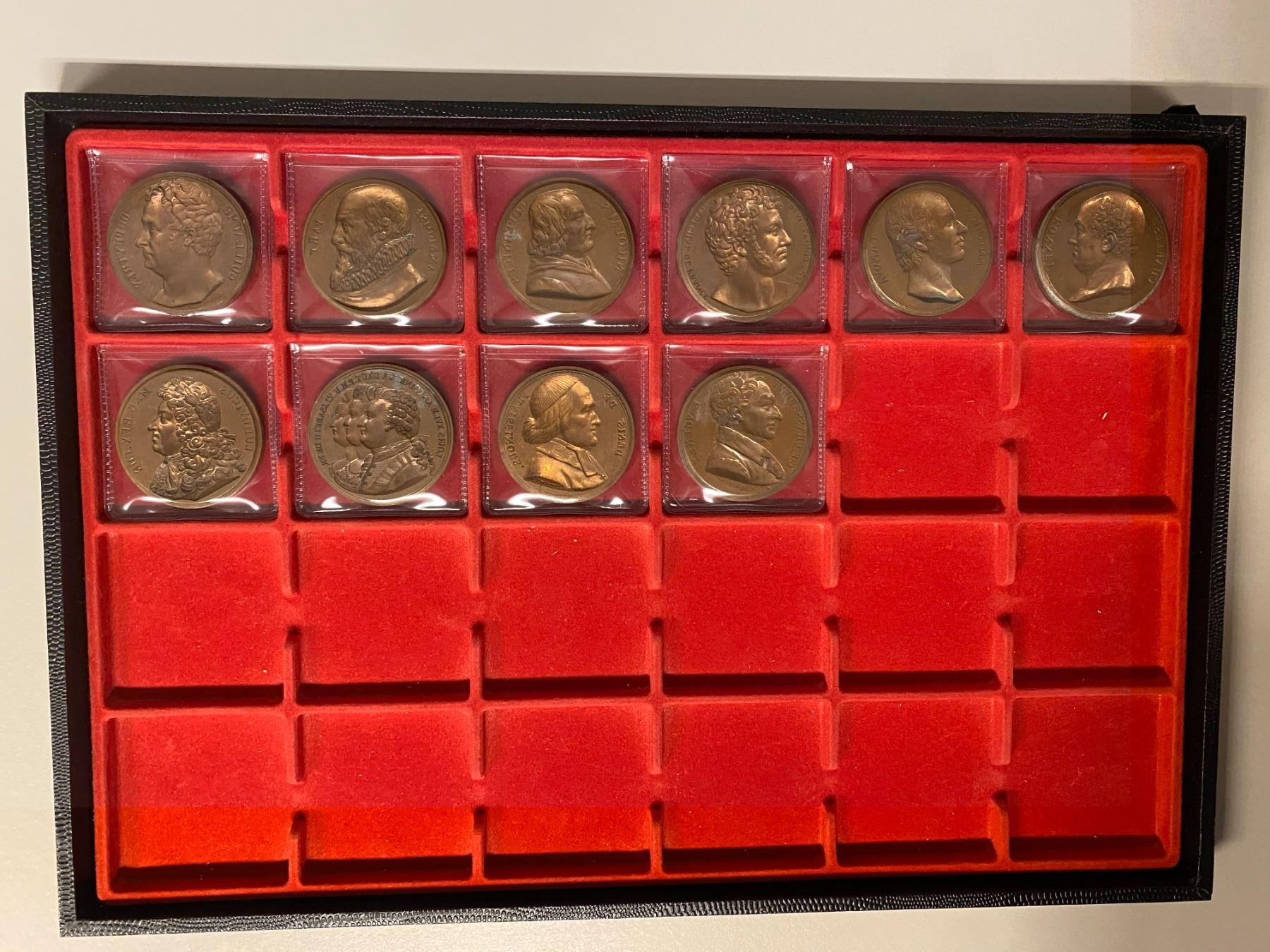 FRANCE: LOT of 10 trial strikes, obverse incuse hub trials, all AE 40-42mm medals (2 appear to have tin [pewter?] reverses), portraits are deeply incuse, subjects include: Guillaume Dupuytren, Ambroise Pare, Nicolaus Copernicus, J. P. Poniatomski Marechal de France, Antonius Canova, Charles Bonnet, Ludovicus (XIV) Rex, Louis XVI.M.Antoinette d'Aut.P.M.H.Elizabeth, Denis de Frayssinous, and C. F. Chasseboeuf e Volney; reverses are uniface with an inked two-diogit number; all appear to be uncirculated, some with some red luister, a few have very slight oxidation, a very unusual collection, plain edges, lot of 10 pieces.