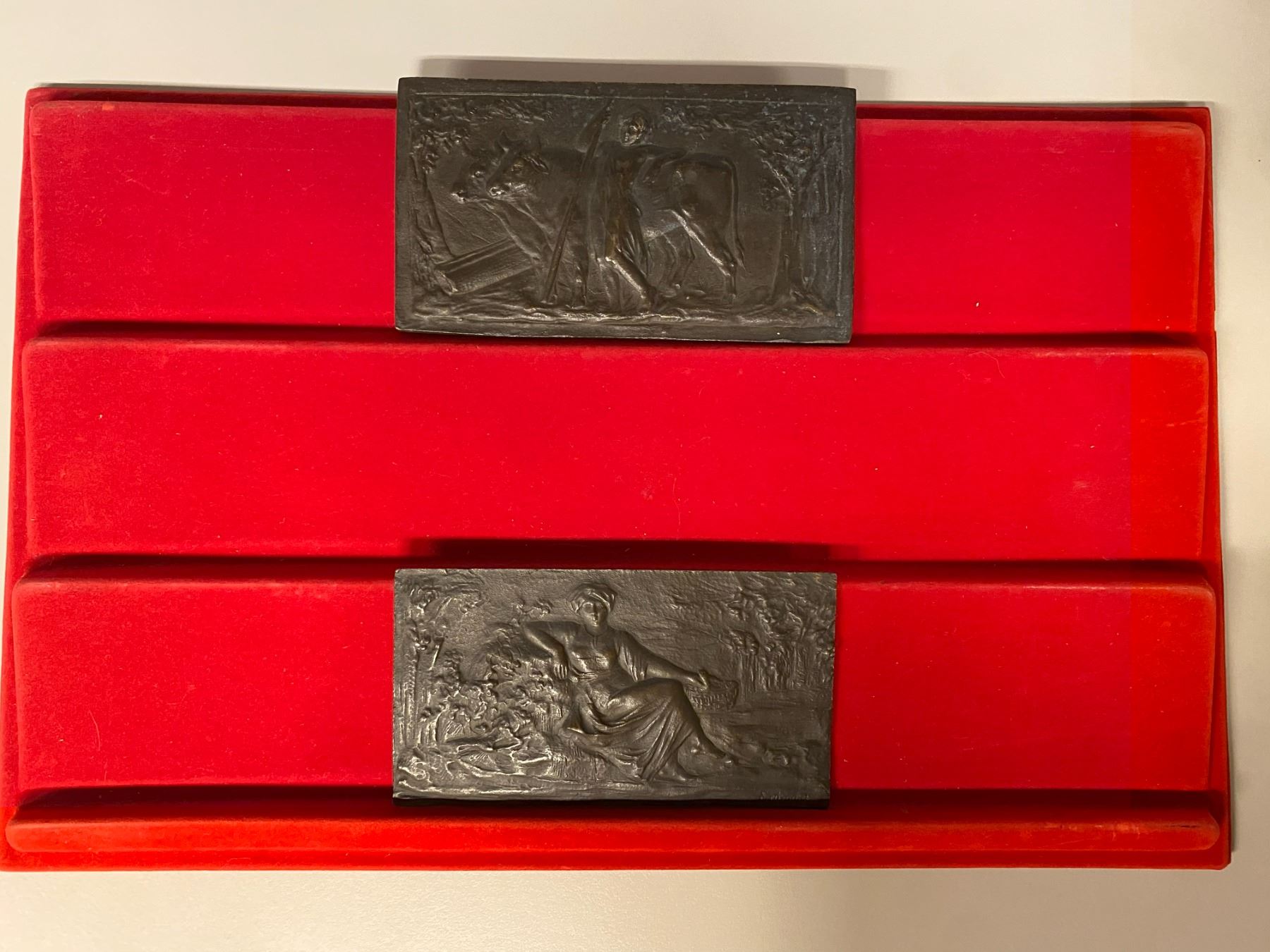 FRANCE: LOT of 2 AE plaques, including ND 80x145mm cast bronze uniface plaque by Édouard Drouot of a semi-reclined seated woman (Asian?) holding a basket taking a break from her gathering, with foliage around and hills in background; and ND 86x155mm cast bronze uniface unsigned (perhaps Drouot) plaque of a child leaning on a staff and leaning back against one of two cows with log behind and trees around, generally as made, no legends or edge markings; retail value $150, lot of 2 plaques.