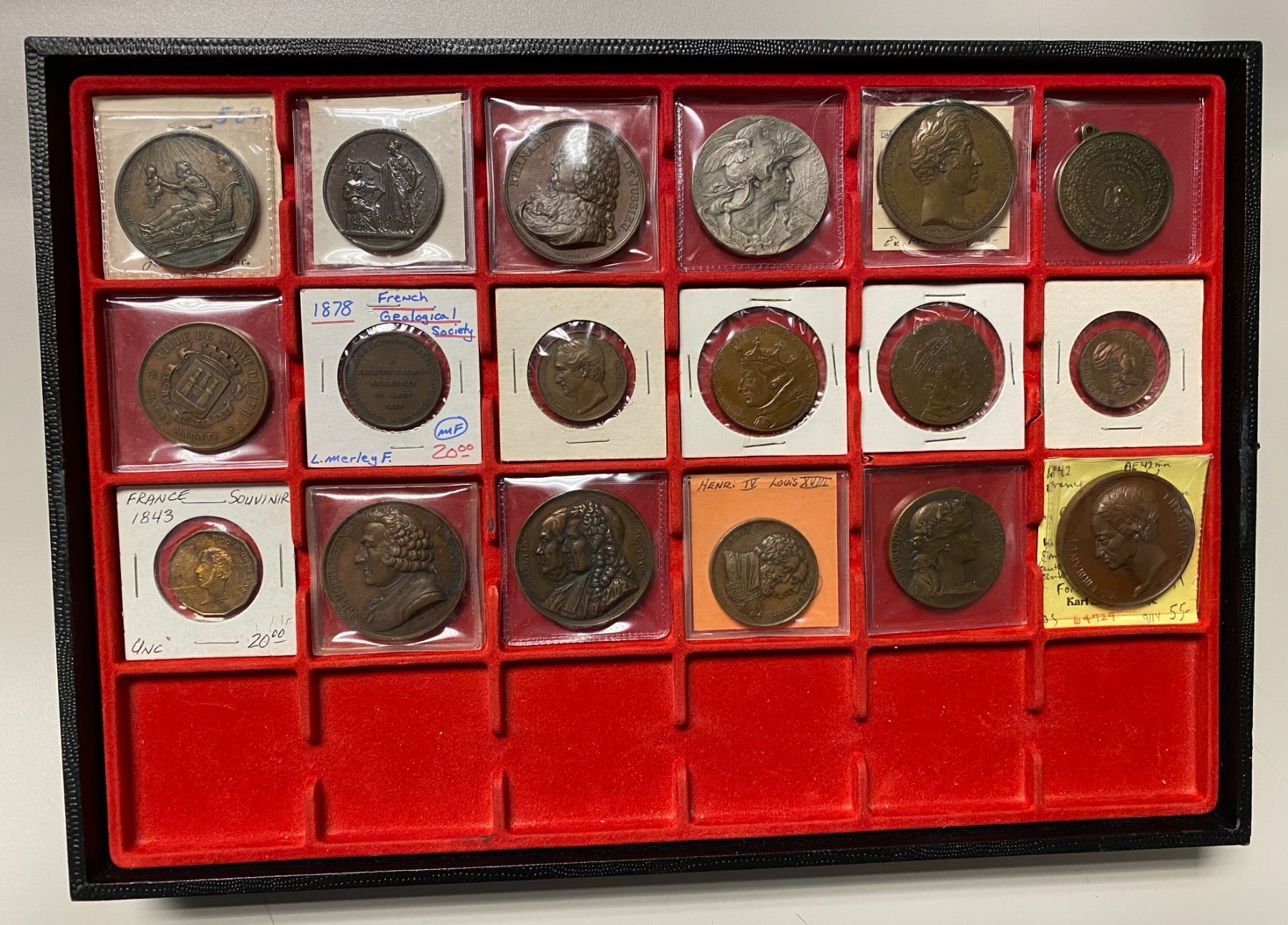 FRANCE: LOT of 29 medals, including 1897 AE Ministere de l'Agriculture award medal, 1883 AE Progress of Humanities, 1830 AE Address of the King, 1836 gilt AE Completion of the Arc de Triomphe, 1865 AE Regional Horse Riding Competition award medal, ND WM Clodian King of France, 1832 AE Jean Baptiste Say, 1825 AE Charles X Coronation, 1855 gilt AE Prince Napoleon Bonaparte President of Commission of the Exposition Universelle, 1842 Death of Ferdinand Philipp Duc d'Orleans, 1893 AE Louis Ruchonnet, 1842 AE Emmanuel Theaulon, ND AE Societé Vigneronne de l'Yonne, ND AE Henri IV and Louis XVIII, 1833 Franklin and Montyon, 1821 AE J. B. Bourguignon d'Anville, 1843 gilt AE Duc d'Orleans, 1848 AE Liberté Egalité Fraternité, ND AE Lothaire King of France, ND AE Charles V King of France, 1849 AE Antoine Eugene deGenoude, 1878 AE French Geneological Soceity, 1880 AE Ville de Saint-Dizier, 1852 AE Boyage of the Prince-President to the Middle of France, 1828 AE Royal Visit to Mulhouse, ND silvered AE La Municipalité du XXe Arrondissement, 1823 AE Bernard de Jussieu, ND AE Aux Sciences et Aux Arts, and 1820 AE Birth of Henri Duke of Bordeaux; average circulated grades, as well as a few uncs, in consignor's holders, viewing recommended; retail value $950, lot of 29 pieces.