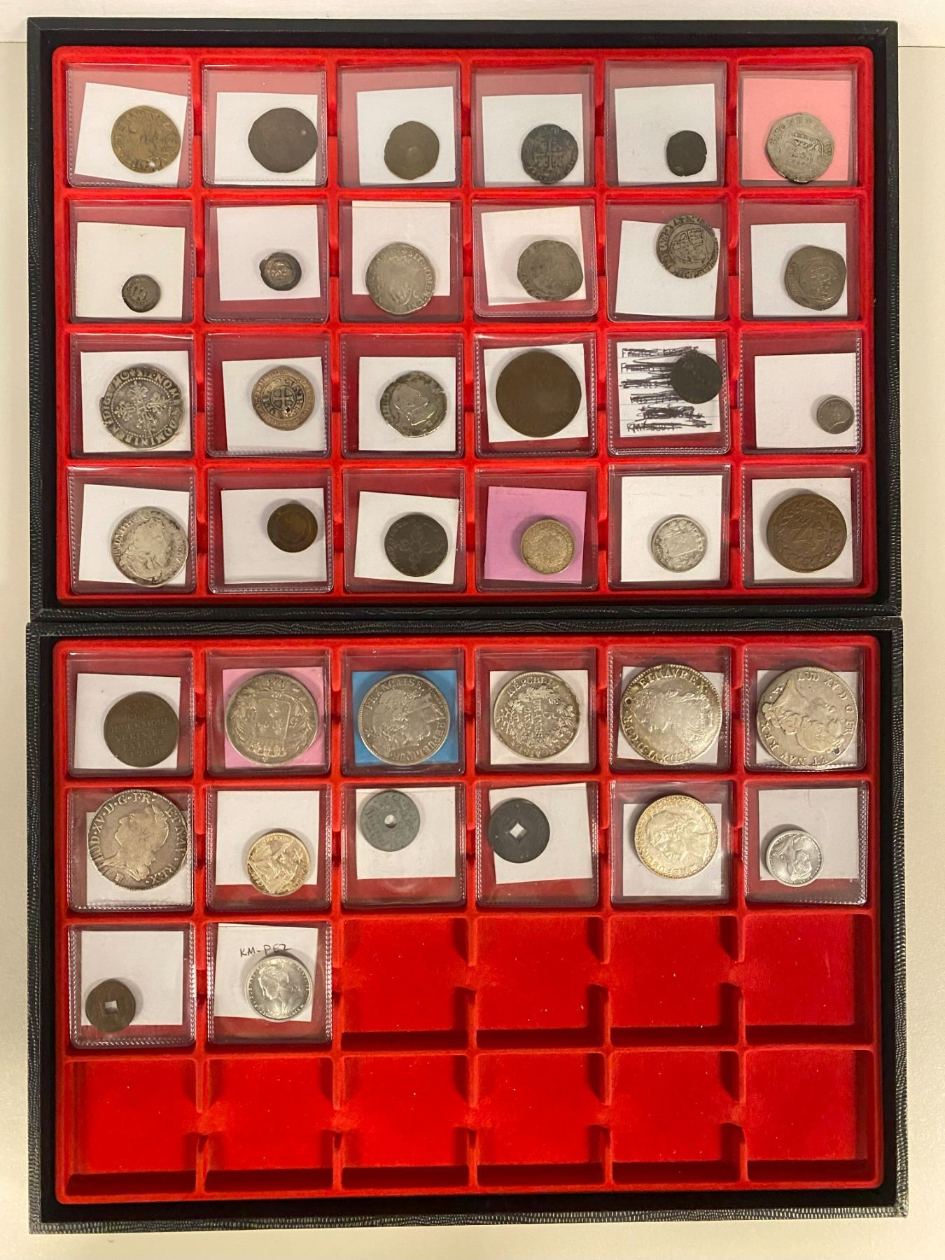 FRANCE: LOT of 38 coins, including 15 hammered coins (2 jetons, 3 billon including a fleur de lyse counterstamp coin, and 10 silver incluing a 1639 Besancon teston), 16 regal issues including 3 ecu (2 holed), 3 5 franc coins, a Lille 20 sols 1708, and 9 others), and 7 colonial issues - a nice collection of a wide variety; retail value $900, lot of 38 pieces.