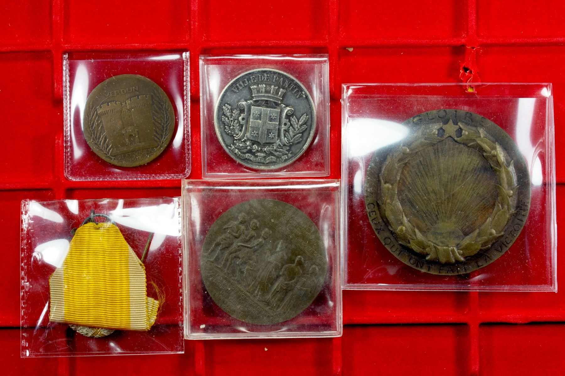 FRANCE: LOT of 5 medals, all World War I related, including ND AR 41mm Ville de Pantin, 1917 AE 37mm Verdun by Vernier, 1914 AE 50mm Bombing of Reims Cathedral, 1918 AE 65mm Victory and Peace by A. Rivaud, and "1870" Model of the Third Republic silver award medal with yellow ribbon; average circulated grades, with some better, in consignor's holders, viewing recommended; retail value $275, lot of 5 pieces.