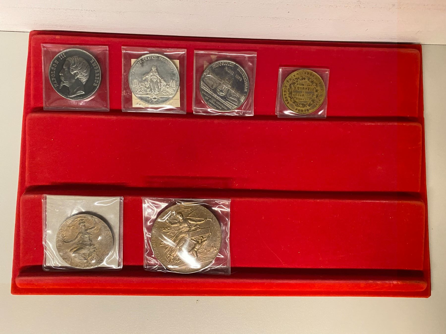 FRANCE: LOT of 6 medals, including 1855 tin 50mm Palais de Industrie, 1855 AE 45mm Exposition Universelle Alexandre & Pere & Fils, 1878 nickel (?) 51mm Exposition Universelle Palais du Trocadero, 1878 WM 51mm Exposition Universelle Palais du Trocadero, 1878 AE 68mm Exposition Universelle award medal (A. Lacroix), and 1900 AE 53mm unawarded Exposition Universelle award medal; average circulated grades, with some better, in consignor's holders, viewing recommended; retail value $225, lot of 6 pieces.