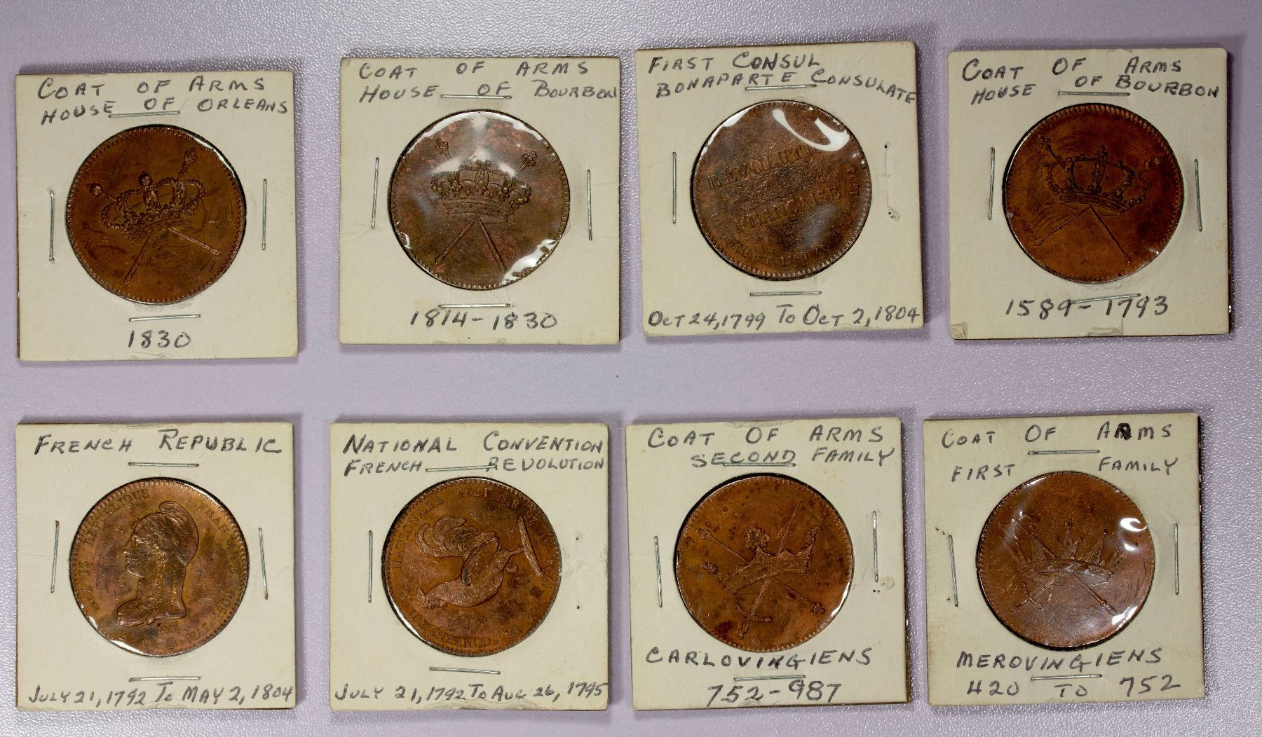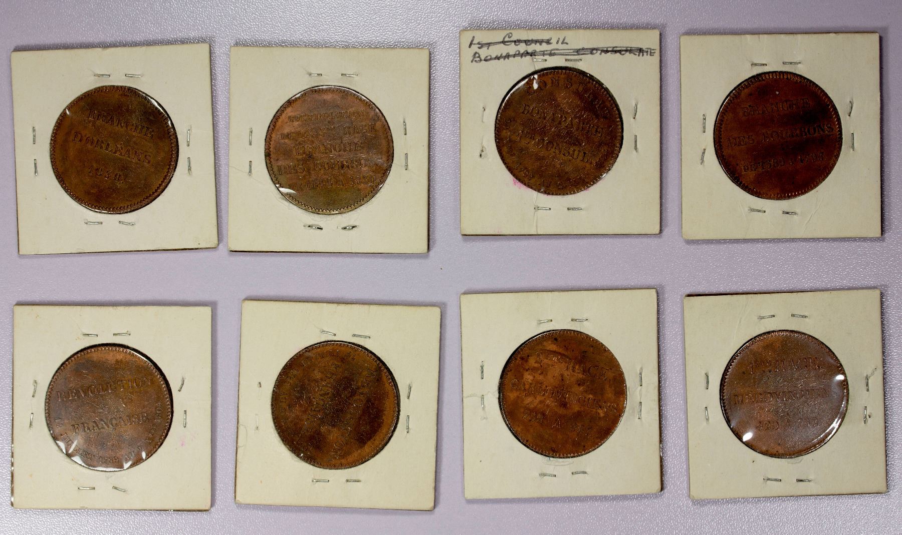 FRANCE: LOT of 8 medals, a series on French History, including pieces for the Merovingians, Carolingians, House of Bourbon, National Convention, French Republic (First), Consulate, Restoration of the Bourbons, and the House of Orleans, all are bronze and 32mm, probably made ca. 1850, by Barre, Dupré, etc., better than average circulated grades, somewhat discolored, some contact marks; in consignor's 2x2 holders, viewing recommended; retail value $1000, lot of 8 pieces.