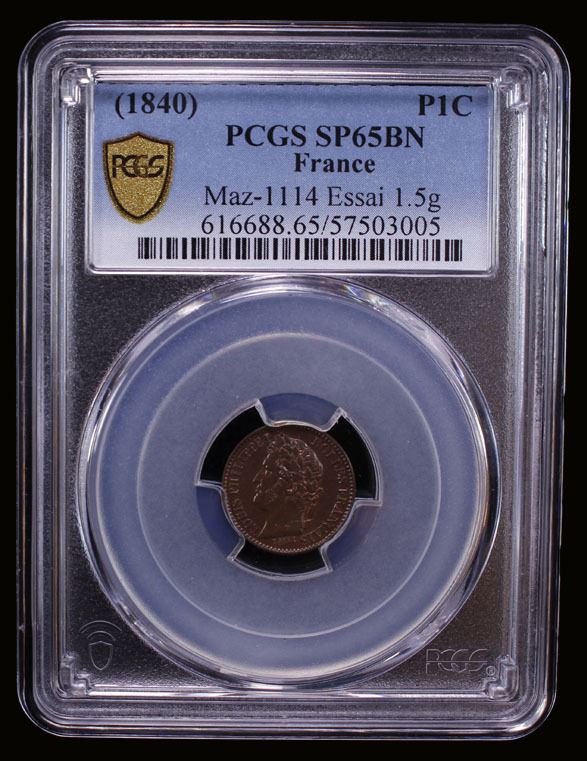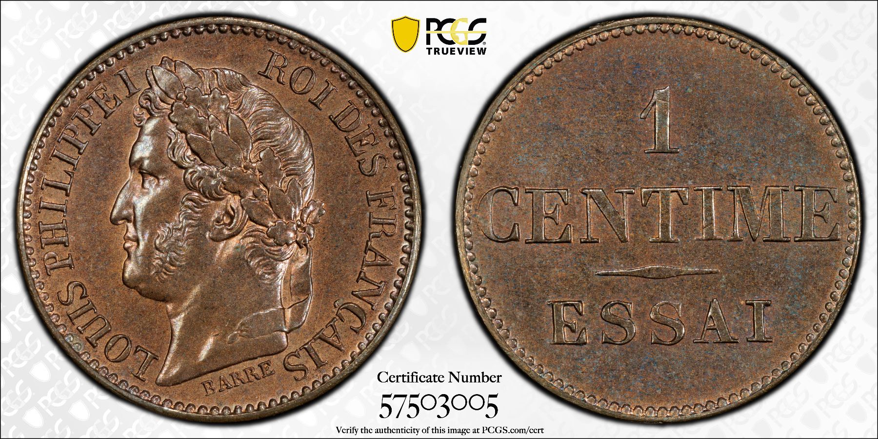 FRANCE: Louis Philippe, 1830-1848, AE centime (1.50g), Paris, ND (1840), Mazard-1114, VG-2802, Gadoury-80, 15mm bronze essai 1 centime by Barre, laureate bust left with LOUIS PHILIPPE I - ROI DE FRANÇAIS around // "1 / CENTIME / ESSAI", much red, rare, plain edge, PCGS graded Specimen 65BN.