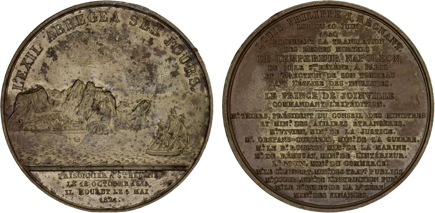 FRANCE: Louis Philippe, 1830-1848, AE medal (66.87g), 1840, Bramsen-1985, Julius-4001, d'Essling-1691, 52mm unsigned silvered bronze medal on the Transfer of Napoleon's Remains to the Invalides in Paris, sailing ship leaves the island of Saint Helena with LEXIL ABRÉGEA SES JOURS around and "PRISONNIER A Ste HELENE, / LE 18 OCTOBRE 1815 / IL MOURUT LE 5 MAI / 1821" in exergue // 23 lines of text, mostly naming the parties involved, mottled tone, CUIVRE and pointing hand privy mark on edge, XF.