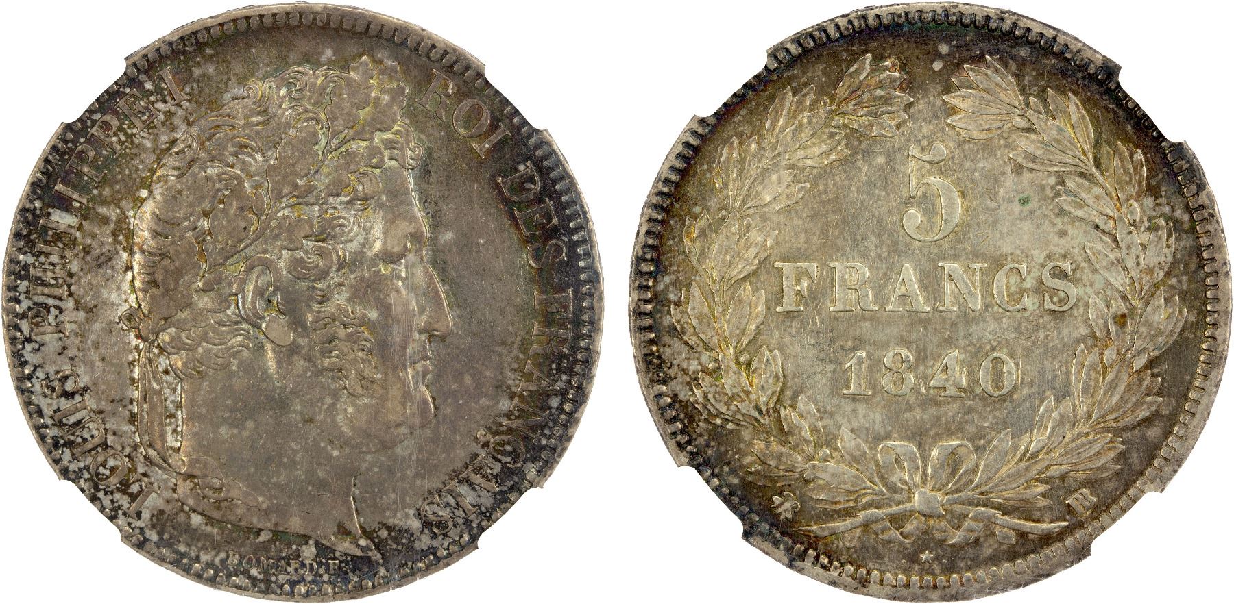 FRANCE: Louis Philippe, 1830-1848, AR 5 francs, 1840-BB, NGC AU55. CAC