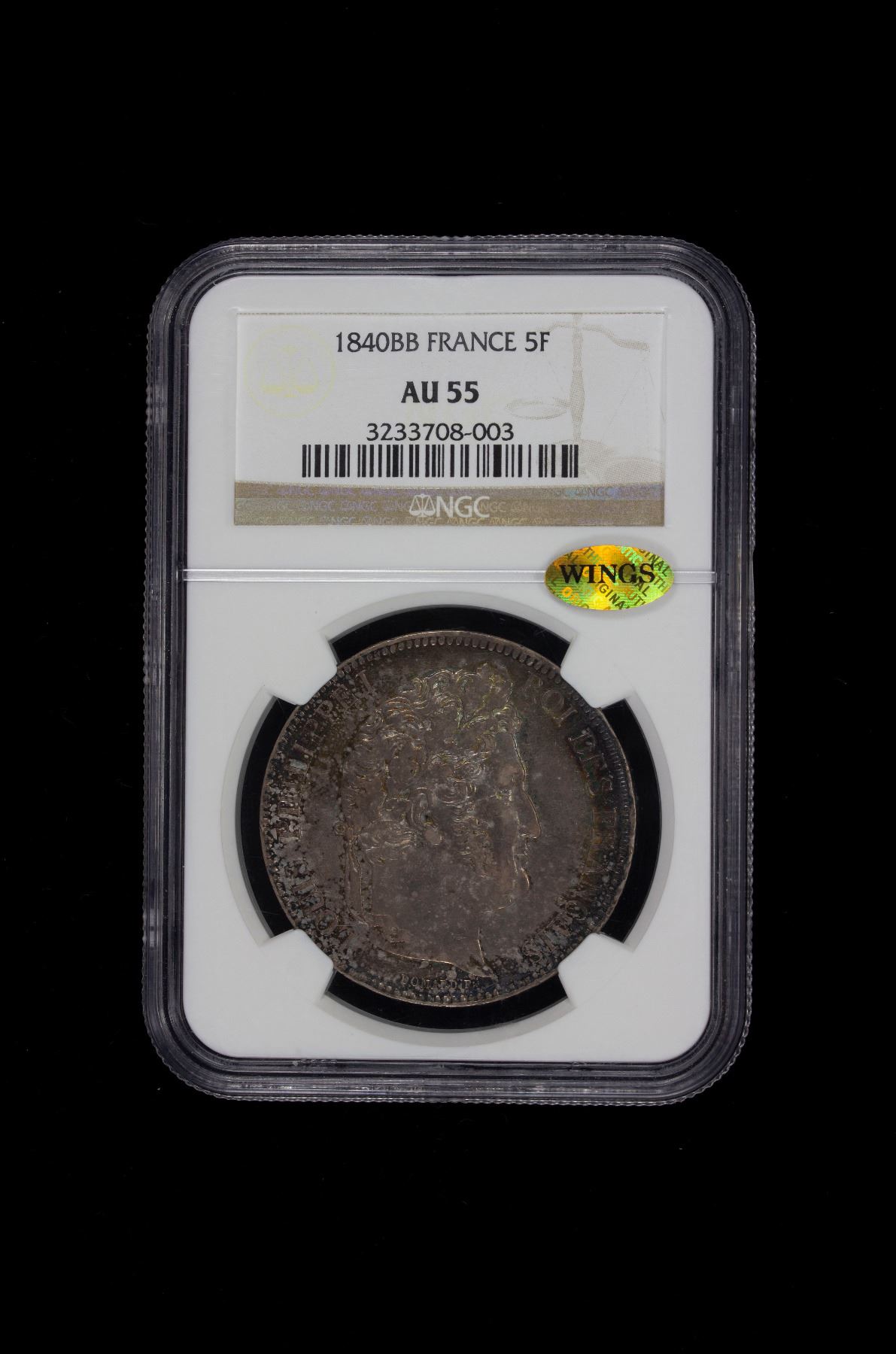 FRANCE: Louis Philippe, 1830-1848, AR 5 francs, 1840-BB, KM-749, Gad-678, Strasbourg Mint, NGC graded AU55. WINGS, ex Louis Baptiste Dupont Collection.