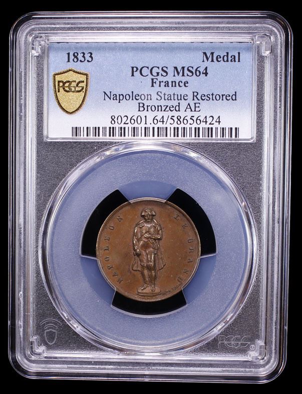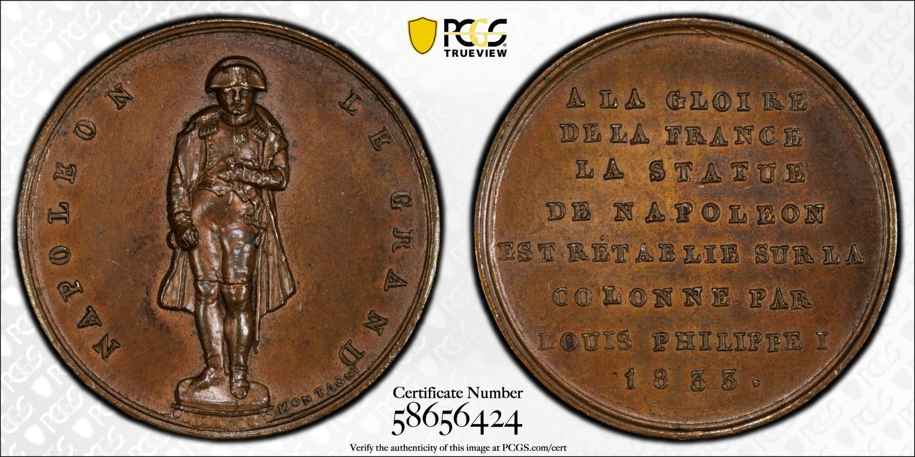 FRANCE: Louis Philippe I, 1830-1848, AE medalet (6.16g), 1833, 26mm bronzed copper medal by Montagny for the Restoration of the Statue of Napoleon; NAPOLÉON LE GRAND around statue, MONTAGNY at lower right // A LA GLOIRE / DE LA FRANCE / LA STATUE / DE NAPOLEON / EST RETABLIE SUR LA / COLONNE PAR / LOUIS PHILIPPE / 1833a wonderful mint state example! PCGS graded MS64. In 1833, King Louis-Philippe commissioned sculptor Charles-Marie Seurre to create a new statue of Napoleon for the Vendôme Column, depicting him as the "Little Corporal," which was inaugurated on July 28, 1833, as a political move to reconcile with Bonapartists after the Bourbon Restoration removed the original.