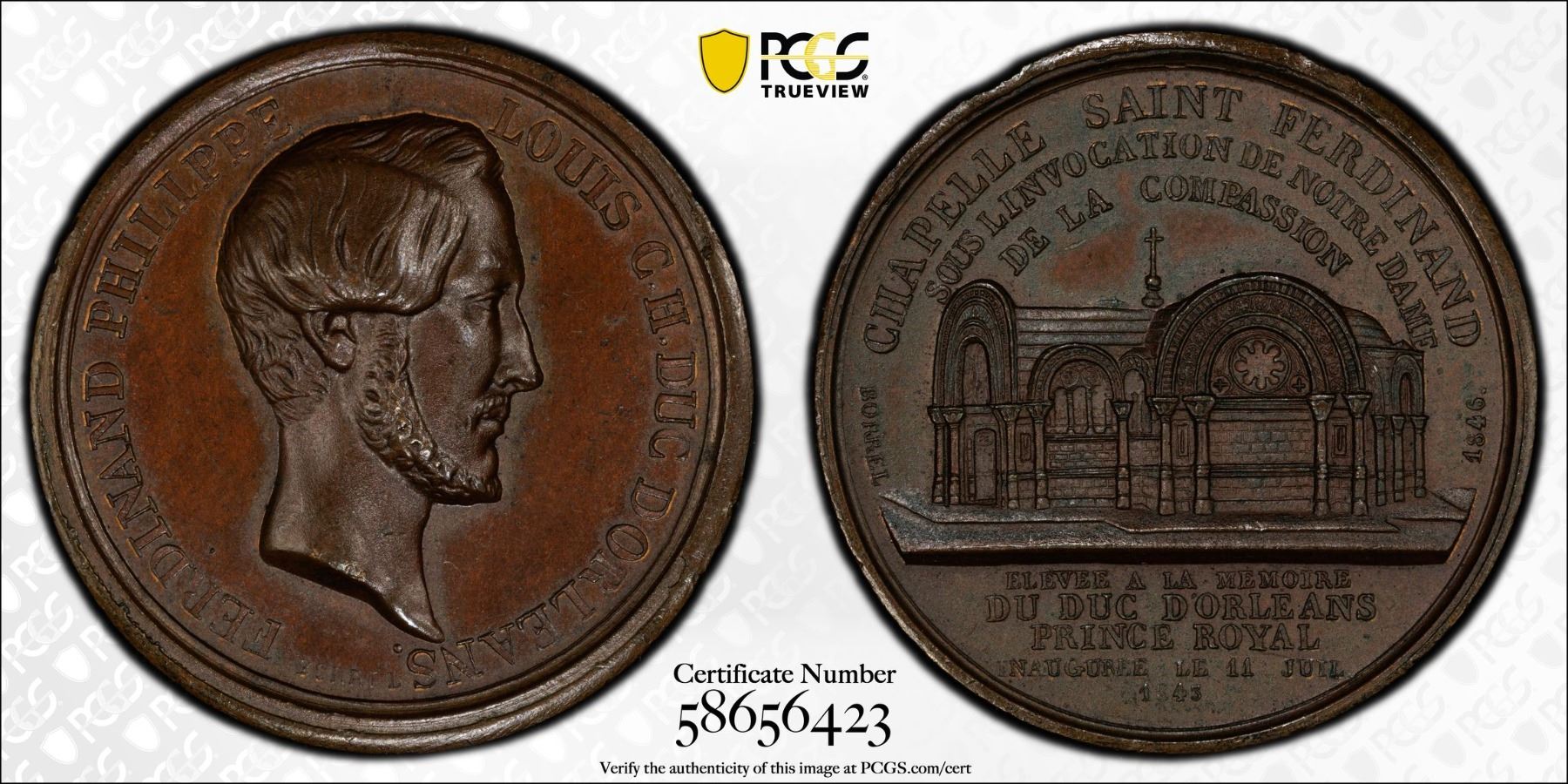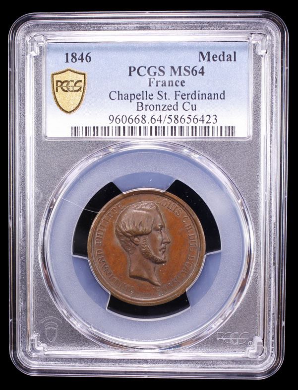 FRANCE: Louis Philippe I, 1830-1848, AE medalet (9.58g), 1846, 26mm bronzed copper medal by Alfred Borrel for the Prince Ferdinand Philippe, Duke of Orléans Memorial; FERDINAND PHILIPPE - LOUIS C. H. DUC D'ORLÉANS, around bust right, signature BORREL F. below, CHAPELLE SAINT FERDINAND / SOUS L'INVOCATION DE NOTRE DAME / DE LA COMPASSION, Chapel of St. Ferdinand with BORREL 1846 either side, in exergue ÉLEVÉE A LA MÉMOIRE / DE S. A. R. L. F. P. DUC D'ORLÉANS / PRINCE ROYAL / INAUGURÉE LE 11 JUILLET / 1843, a wonderful mint state example! PCGS graded MS64. Prince Ferdinand Philippe, Duke of Orléans (1810-1842) was the eldest son of King Louis Philippe I of France and Maria Amalia of Naples and Sicily. On 13 July 1842 he was killed when the horses of his carriage ran out of control at Sablonville in the Hauts-de-Seine département, he lost his balance and fractured his skull, and, despite the best attentions of his doctors, the 31-year-old Duke died some hours later, surrounded by family members who had rushed to the scene.