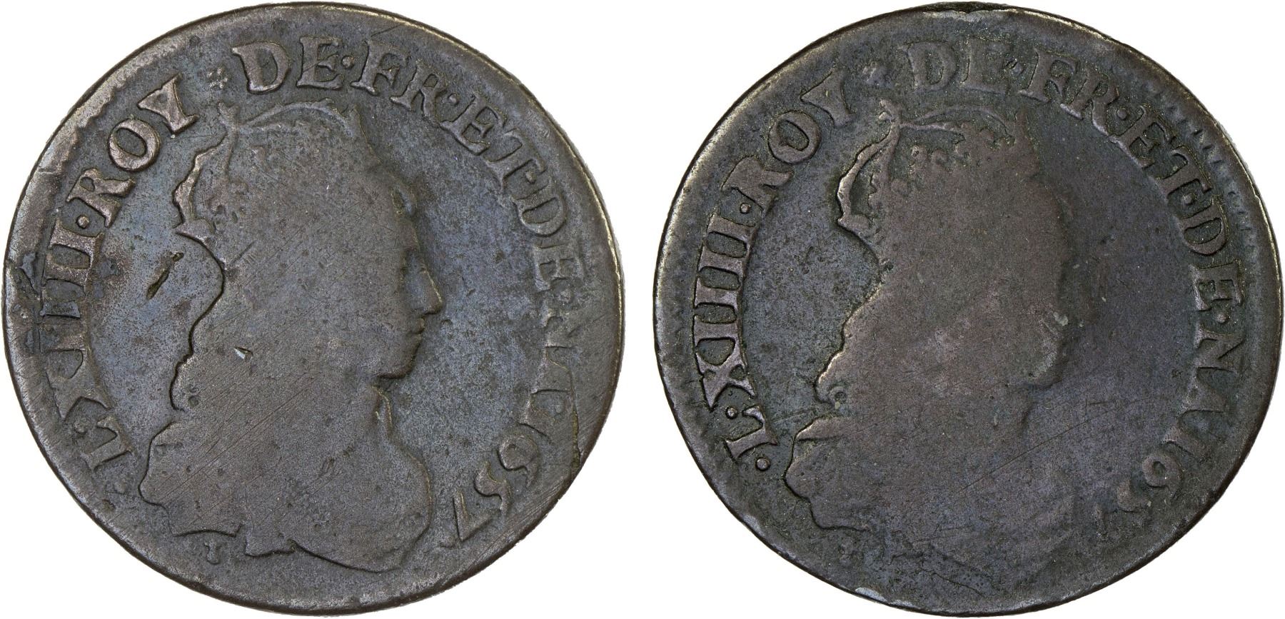 FRANCE: Louis XIV, 1643-1715, AE liard (5.61g), 1657, KM-192, error struck with two obverse dies, VG.