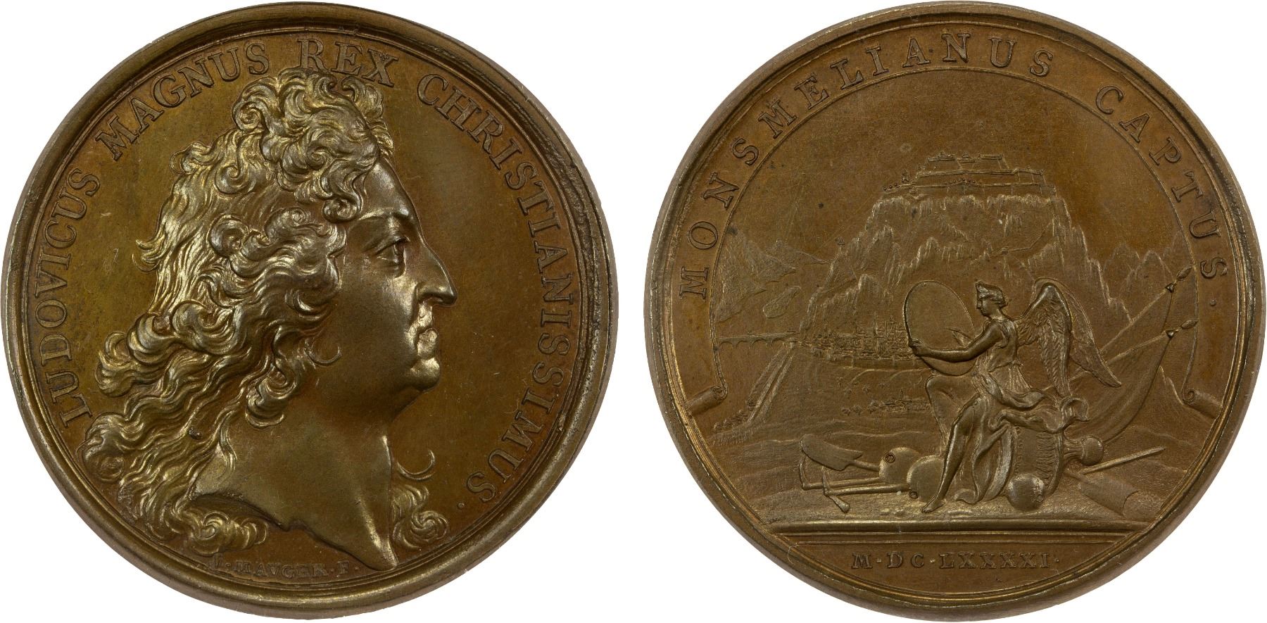 FRANCE: Louis XIV, 1643-1715, AE medal, 1691, Divo-239, 41mm bronze medal by Mauger for the Capture of the Fortress of Montmélian; LUDOVICUS XIIII. REX CHRISTIANISSIMUS around bust of King right // MONSMELIANUS CAPTUS above Victory seated on mortars next to flags as she writes on shield, view of City and Castle upon a hill in background, a wonderful mint state example! PCGS graded MS64. This medal celebrates the capture of the town and fortress of Montmélian during the Nine Years' War in Piedmont-Savoy, as part of French King Louis XIV's campaign against Victor Amadeus, the Duke of Savoy, who had sided with the Grand Alliance the previous year.