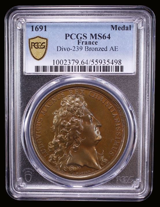 FRANCE: Louis XIV, 1643-1715, AE medal, 1691, PCGS MS64
