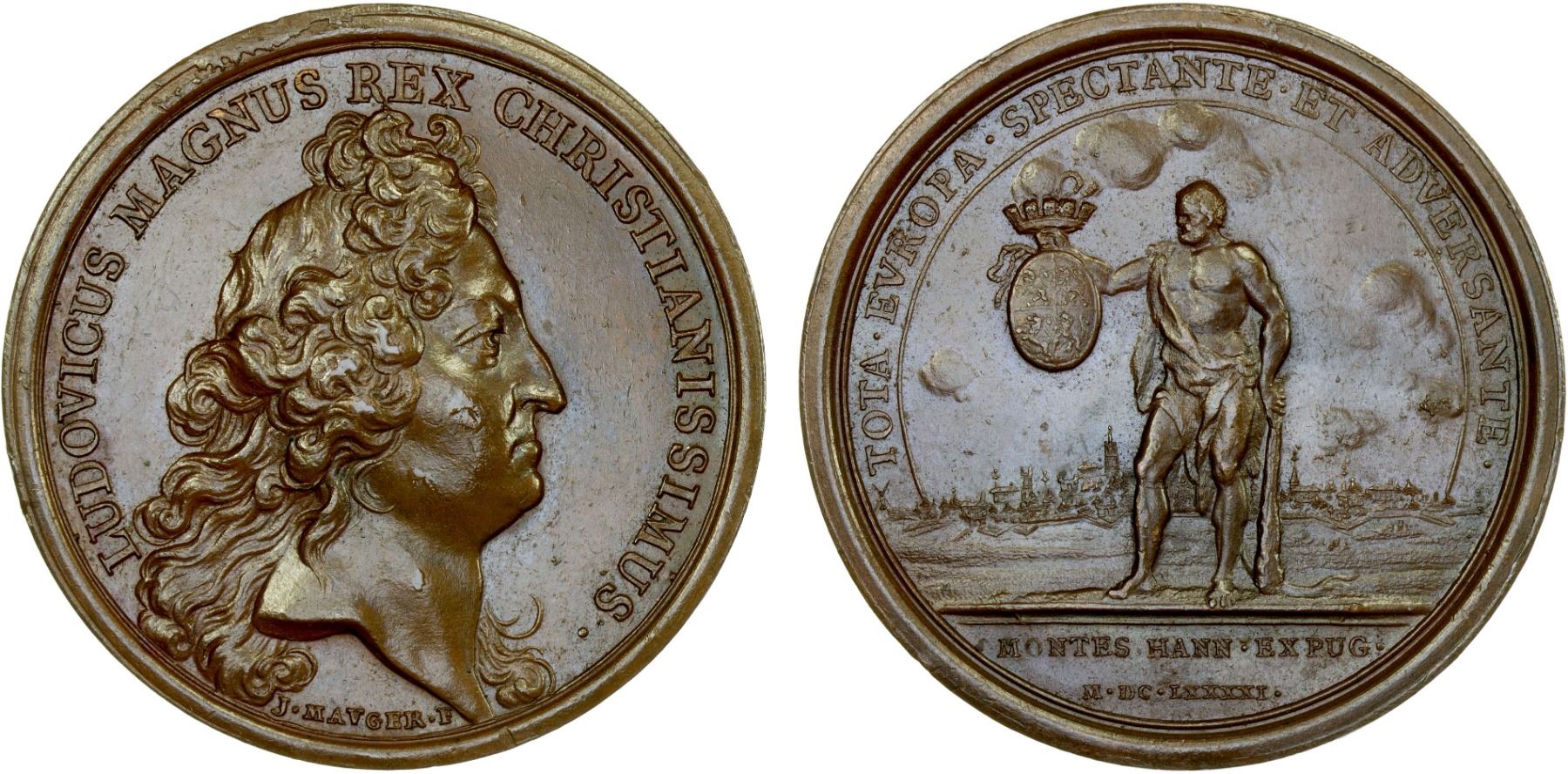 FRANCE: Louis XIV, 1643-1715, AE medal (33.35g), 1691, Divo-235, van Loon-IV:45, 2, 41mm bronze medal on the Capture of Mons by Mauger, bust right with LUDOVICUS MAGNUS REX CHRISTIANISSIMUS. around // standing Hercules, leaning on a club and holding an escutcheon with the arms of the city of Mons, surmounted by a mural crown; in the distance, a view of the city and its fortifications, brown, plain edge, AU. After defeating his rival, King James II, in Ireland, King William III of England led his troops into Flanders with the intention of bringing the war to France. Mons was taken by the French after a three-week siege.