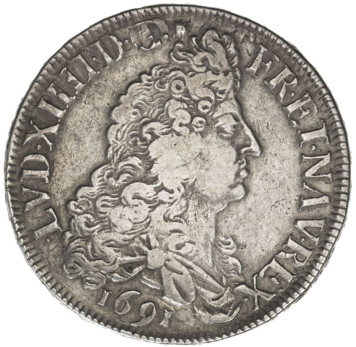 FRANCE: Louis XIV, 1643-1715, AR écu (26.89g), Rennes, 1691, KM-275.21, Duplessy-1514A, mintmark: 9, VF.
