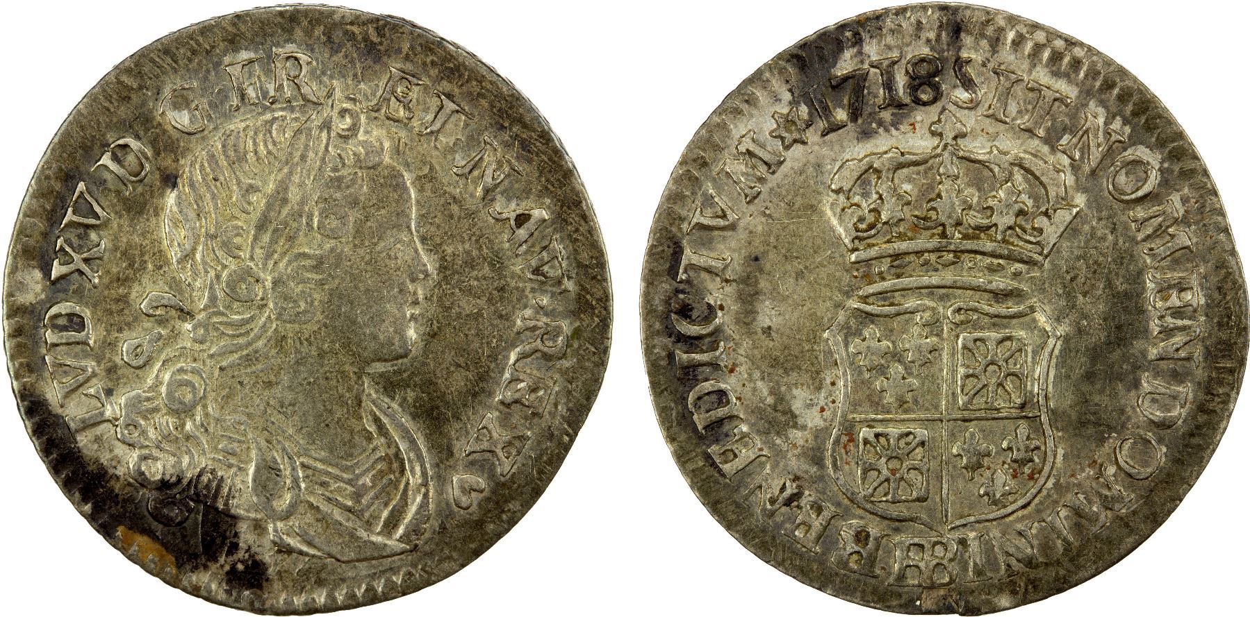 FRANCE: Louis XV, 1715-1774, 12 sols (1/10 écu), 1718-BB, KM-418.2, Strasbourg Mint, VF, ex Almer H. Orr III Collection.