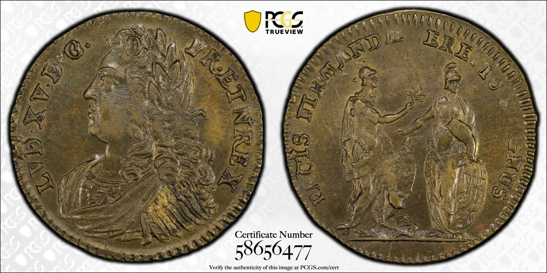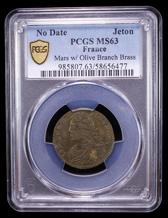 FRANCE: Louis XV, 1715-1774, AE jeton, ND (1719), Feuerdant-13223, 25mm bronze jeton for the The Capture of Fontarabia in Basque Country; LVD XV D G FR ET N REX around laureate, draped and cuirassed bust left of King left // PACIS FIRMANDÆ EREPTUM PIGNUS around France, helmeted, standing right, resting on shield and presenting laurel-branch to Spain, standing left, resting on shield, likely produced in Nuremberg, a lovely mint state example! PCGS graded MS63. Fontarabia (modern Hondarribia), a Spanish border town, was captured by French forces under Duke of Berwick in June 1719 during a brief war, an event commemorated by French jetons (tokens) featuring Louis XV, highlighting this military success and bolstering French prestige in the region.