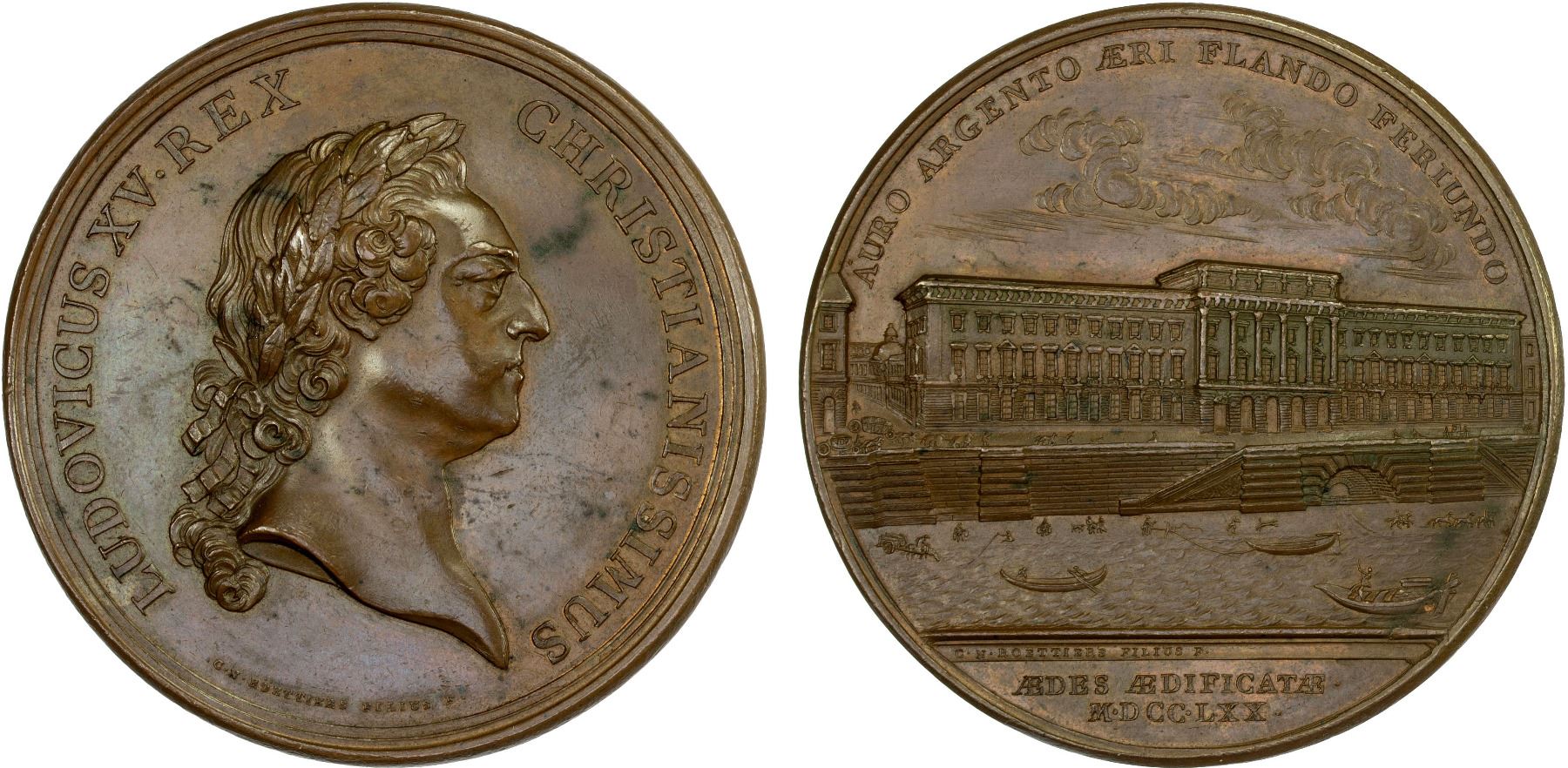 FRANCE: Louis XV, 1715-1774, AE medal (157.0g), 1770, Page-Divo-179, Wurzbach Coll.-5571, 64mm bronze medal for the New Mint Building in Paris by C. N. Röettiers, laureate bust right with LUDOVICUS XV REX - CHRISTIANISSIMUS around // three-quarter view of the building and the Quai de Conti with boats in the Seine below and AURO ARGENTO AERI FLANDO FERIUNDO around and AEDES AEDIFICATAE / M.DCC.LXX in exergue, a few dark obverse spots, some red, plain edge, AU.