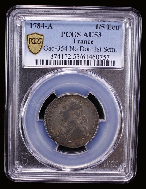 FRANCE: Louis XVI, 1774-1790, AR 1/5 écu (24 sols), Paris, 1784-A, KM-569.1, Gadoury-354, variety with no dot, 1st semester, nicely toned, rare date/mintmark, PCGS graded AU53.
