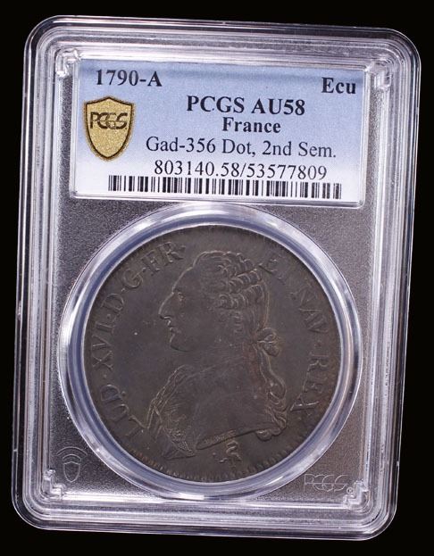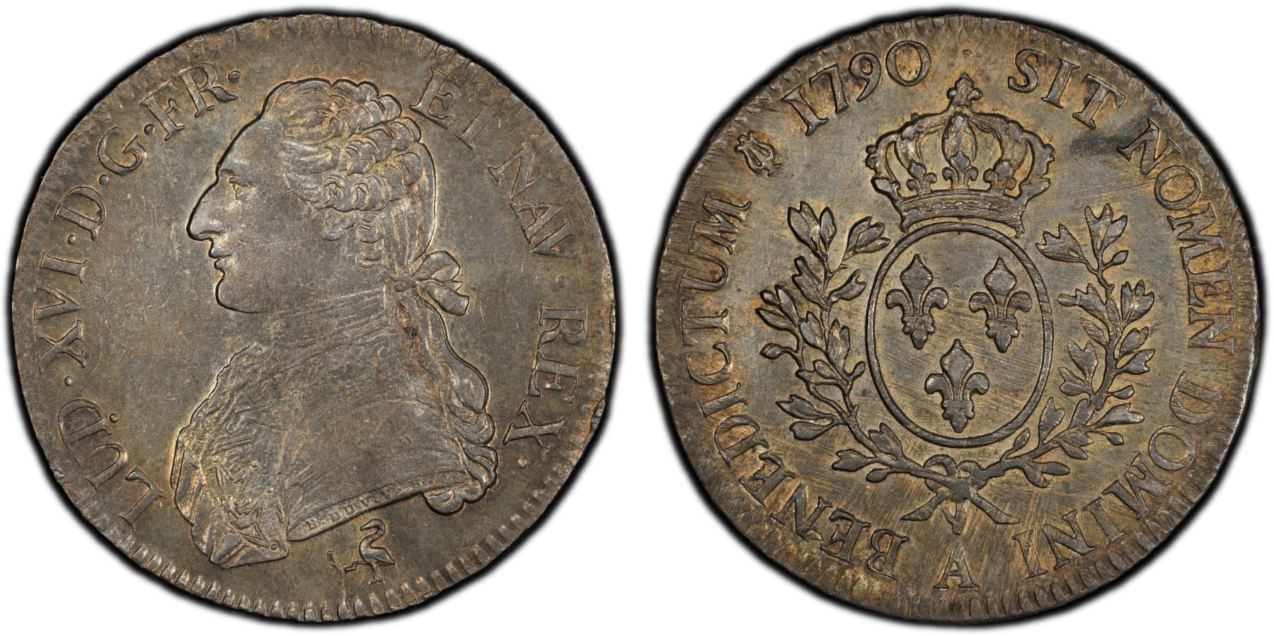 FRANCE: Louis XVI, 1774-1790, AR écu aux branches olivier, Paris, 1790-A, KM-564.1, Gadoury-356, beautiful deep tone and well struck, PCGS graded AU58.