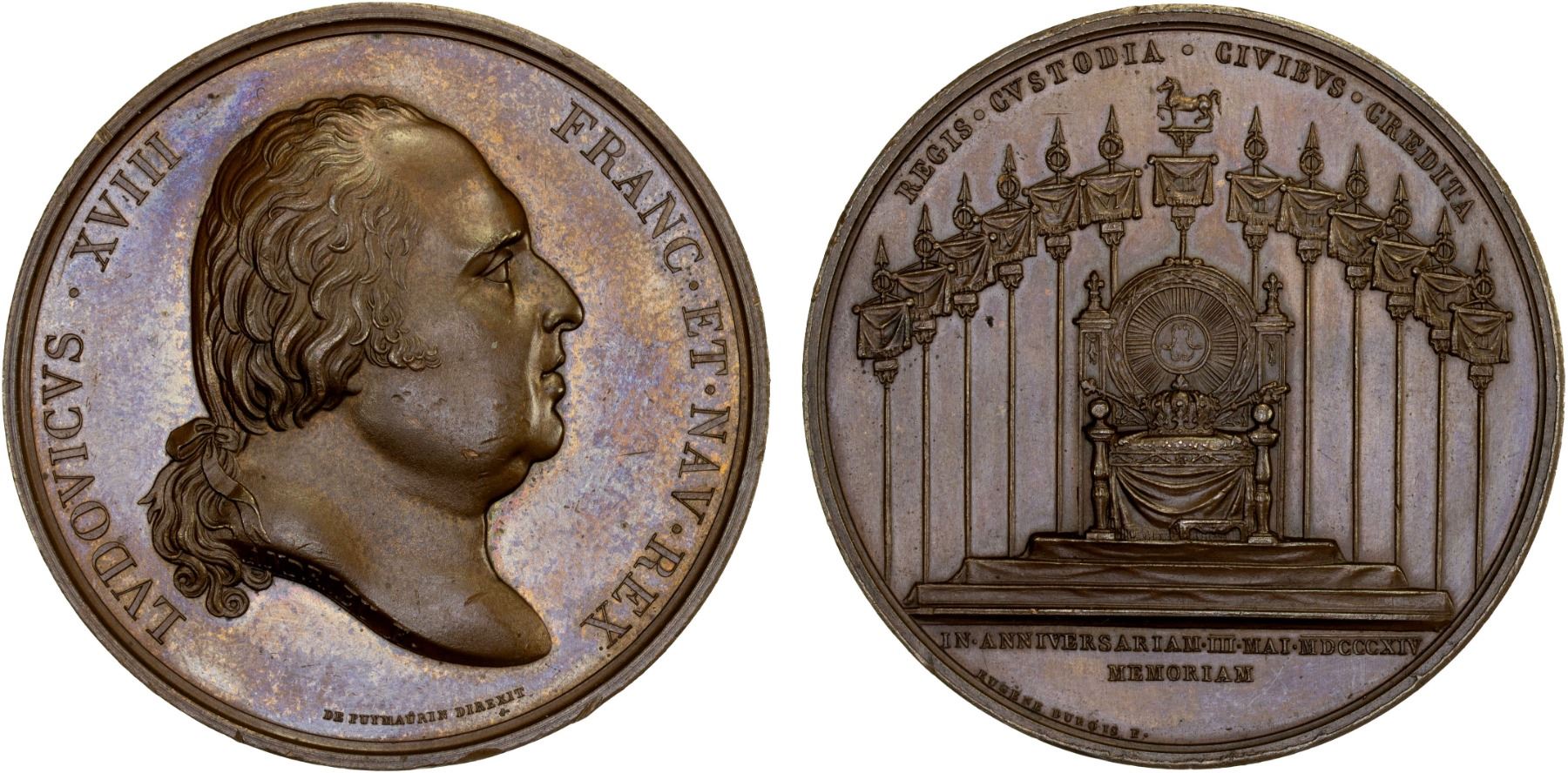 FRANCE: Louis XVIII, 1st reign, 1814-1815, AE medal, 1814, Julius-3302, Bramsen-1614, 51mm bronze medal by Andrieu und Dubois for he Bourbon Restoration; LVDOVICVS XVIII FRANC ET NAV REX around bare head right, hair tied en queue, ANDRIEU F. on truncation, DE PUYMAURIN DIREXIT below // The Emblems of monarchy placed on an empty throne, behind the 13 standards of the Garde Nationale de Paris, REGIS. CVSTODIA. CIVIBVS. CREDITA. above, and IN. ANNIVERSARIAM. III MAY. MDCCCXIV MEMORIAM. in exergue, lustrous, AU.