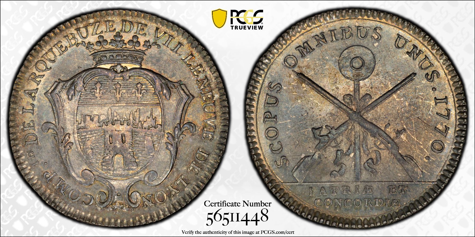 FRANCE: Lyon, AR jeton, 1770, Feuardent-10786, 29mm silver jeton for the Arquebusiers of the Villeneuve of Lyon, arms of the Villeneuve with COMP .ie DE L'ARQUEBUZEDE VILLENEUVE DE LYON around // crossed rifles with standing target behind, all tied together with ribbon, with "SCOPUS OMNIBUS UNUS 1770." around and PATRIE ET / CONCORDIAE in exergue, deep original tone, reeded edge, PCGS graded MS63.