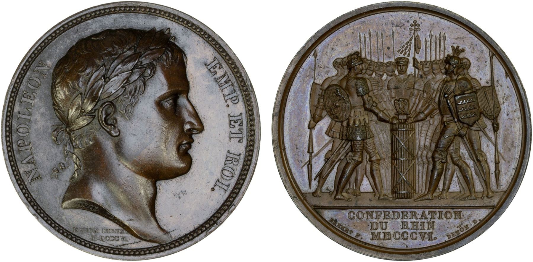 FRANCE: Napoleon I, 1804-1814, 1815, AE medal (35.27g), 1806, Bramsen-534, Julius-1589, 40mm bronze medal by Andrieu and Brenet; mintmaster Denon, commemorating the Confederation of the Rhine; NAPOLEON EMP ET ROI, laureate head right; ANDRIEU F. DENON DIRT. in two lines below // fourteen German princes standing in a semicircle, placing right hands on fasces surmounted by Imperial Eagle; CONFEDERATION DU RHIN MDCCCVI. in three lines in exergue, BRENET F. lower left, DENON DT. lower right, very light obverse oxidation, plain edge, Unc.