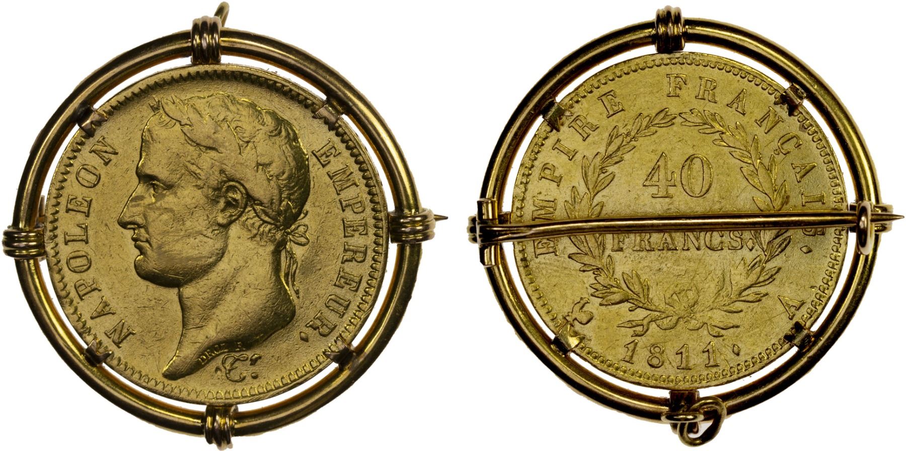 FRANCE: Napoleon I, 1804-1814, 1815, AV 40 francs, 1811-A, KM-696, set in gold bezel with pin back, VF, ex Syed Rabbi Collection.