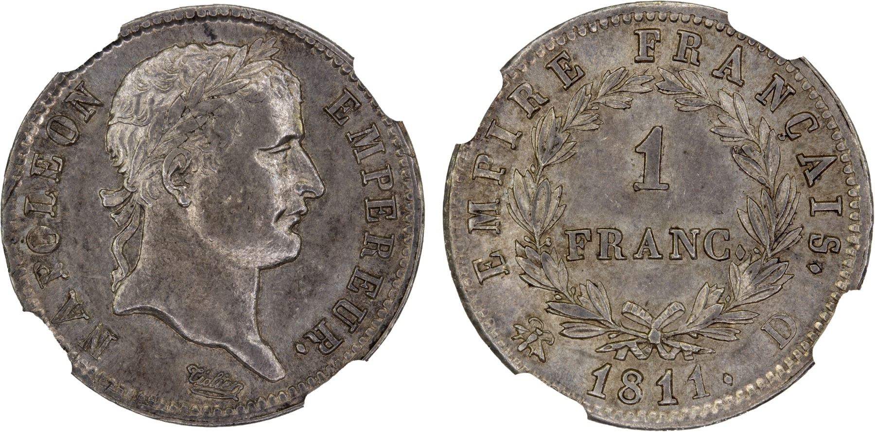 FRANCE: Napoleon I, Emperor, 1804-1814, 1815, AR franc, Lyon, 1811-D, NGC AU58
