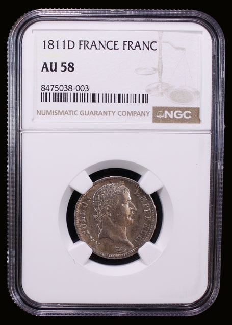 FRANCE: Napoleon I, Emperor, 1804-1814, 1815, AR franc, Lyon, 1811-D, KM-692.5, Gadoury-447, lustrous, NGC graded AU58.