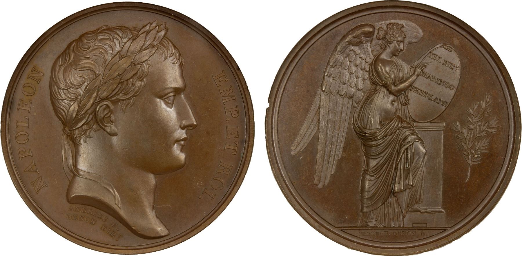 FRANCE: Napoleon I, Emperor, 1804-1814, AE medal, 1806, Bramsen-633, 40mm bronze medal by Andrieu and Brenet, mintmaster Denon, commemorating the Battle of Friedland and the Anniversary of Marengo; NAPOLEON EMP ET ROI, laureate head to right, ANDRIEU F. DENON DIR in two lines below // Victory standing to right, inscribing XIV JUIN MARINGO FRIEDLAND on shield set on column, olive branch to right; BRENET F. DENON D. in exergue, a wonderful mint state example! NGC graded MS64 BN.