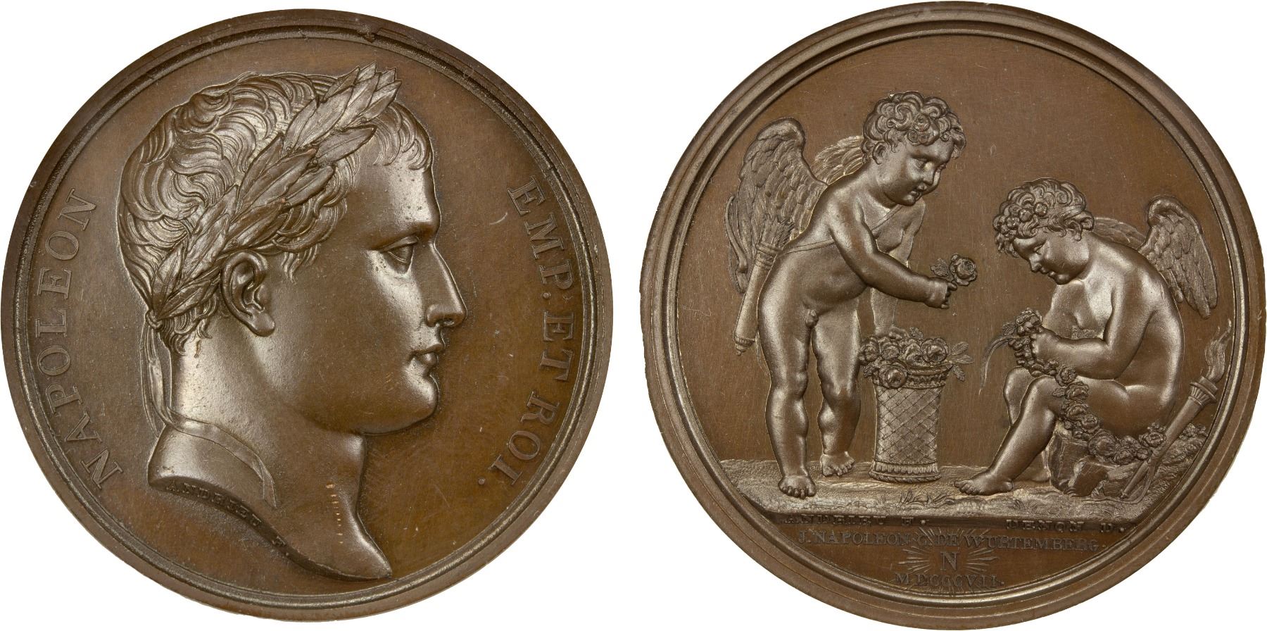 FRANCE: Napoleon I, Emperor, 1804-1814, AE medal, 1807, Bramsen-662, 40mm bronze medal by Andrieu, mintmaster Denon, celebrating the Marriage of Jérôme-Napoléon Bonaparte, King of Westphalia, to Katharina von Württemberg; NAPOLEON EMP ET ROI, laureate head right; ANDRIEU F. on neck truncation // Cupid, standing to right, resting hand on basket of flowers and presenting flower to Hymen, seated to left, holding garland; torch to lower right; ANDRIEU F. DENON D. on exergual line, J. NAPOLEON C. DE WURTEMBERG / radiant "N" / MDCCCVII. in three lines in exergue, a wonderful mint state example! NGC graded MS64 BN.