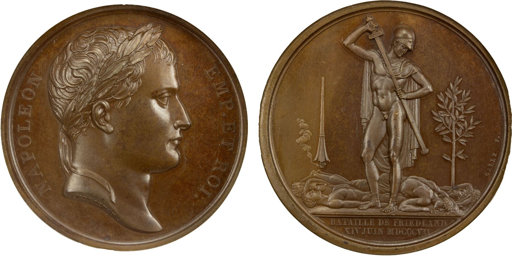 FRANCE: Napoleon I, Emperor, 1804-1814, AE medal, 1807, Bramsen-632, 40mm bronze medal by Andrieu and Galle, mintmaster Denon, commemorating the Battle of Friedland; NAPOLEON EMP ET ROI, laureate head right; ANDRIEU F. on truncation of neck // heroic figure of Mars standing left, head right, returning sword to sheath; six slain corpses on ground behind; in background to left, reversed and extinguished torch; laurel tree to right; GALLE F. to right; BATAILLE DE FRIEDLAND / XIV JUIN MDCCCVII in two lines in exergue, a superb mint state example! NGC graded MS65 BN.