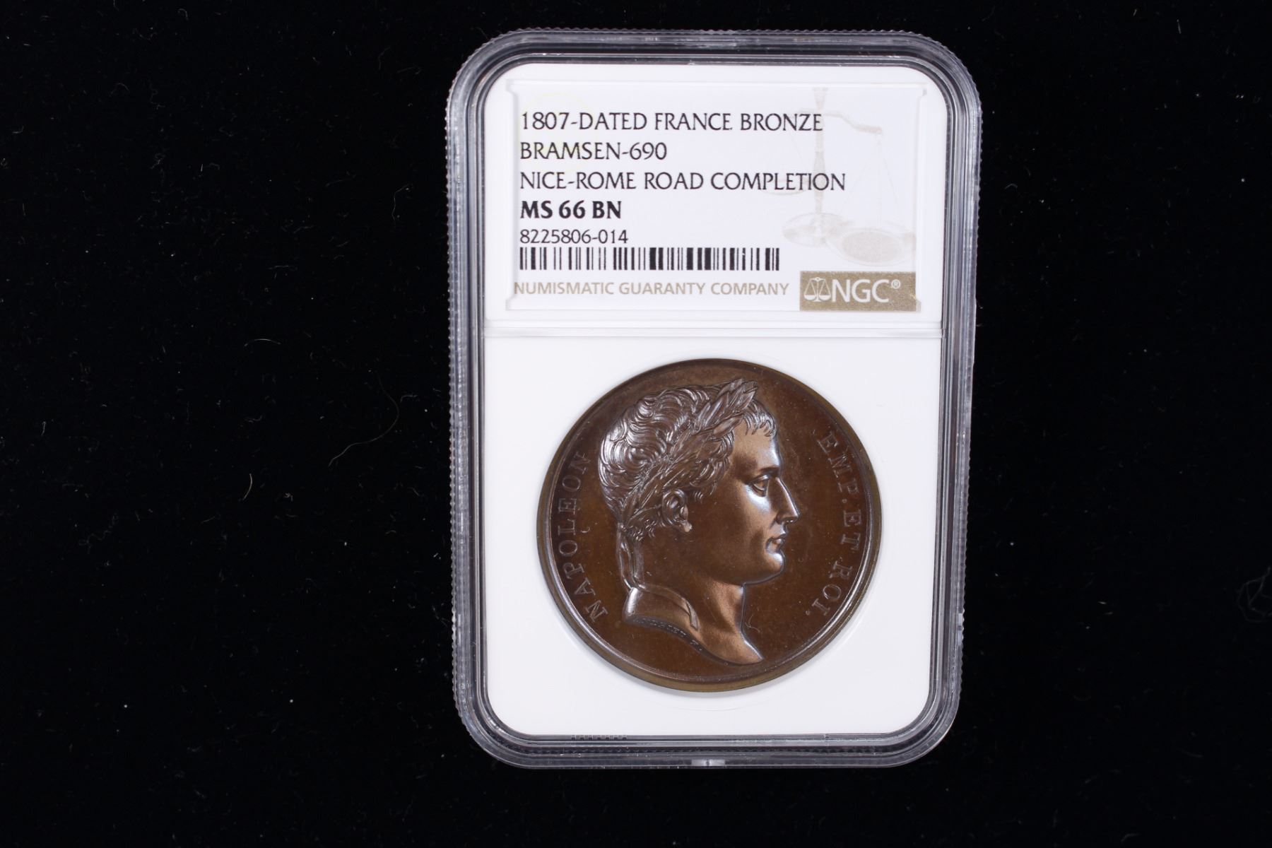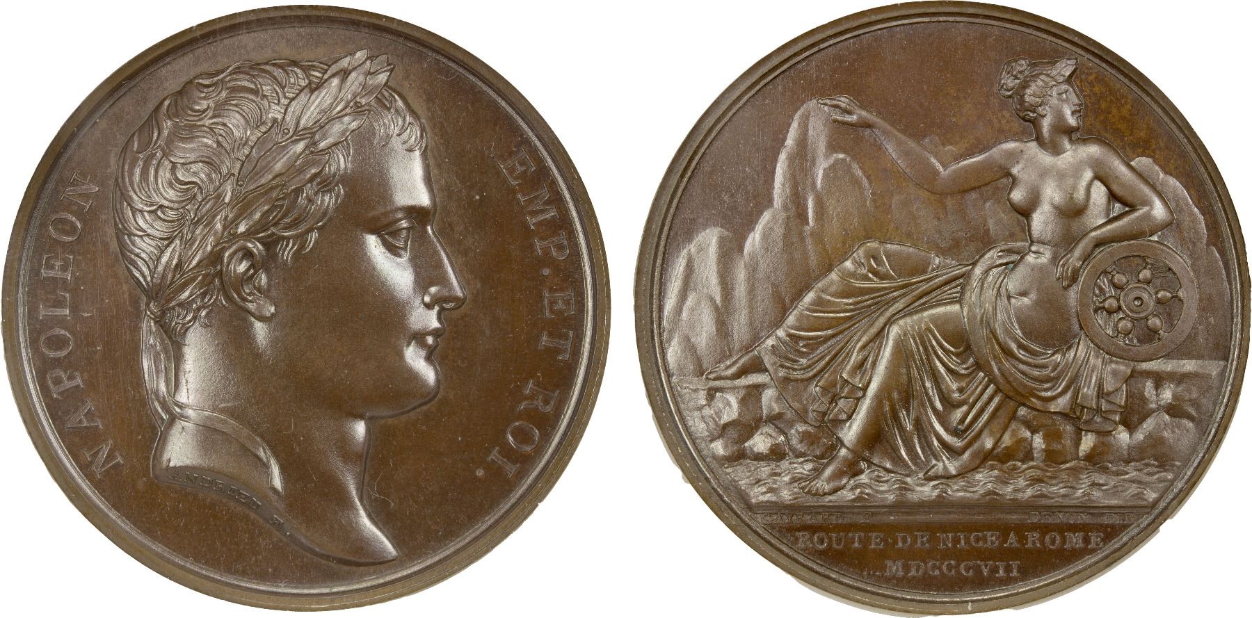 FRANCE: Napoleon I, Emperor, 1804-1814, AE medal, 1807, Bramsen-690, 40mm bronze medal by Andrieu and Gayrard, mintmaster Denon, commemorating the Completion of the Road from Nice to Rome; NAPOLEON EMP ET ROI, laureate head right; ANDRIEU F. on neck truncation // Vibilia reclining to left, head to right, resting elbow on wheel and raising arm, mountains in background; GAYRARD F and DENON DIR to left and right on exergual line, a fantastic mint state example! NGC graded MS66 BN.