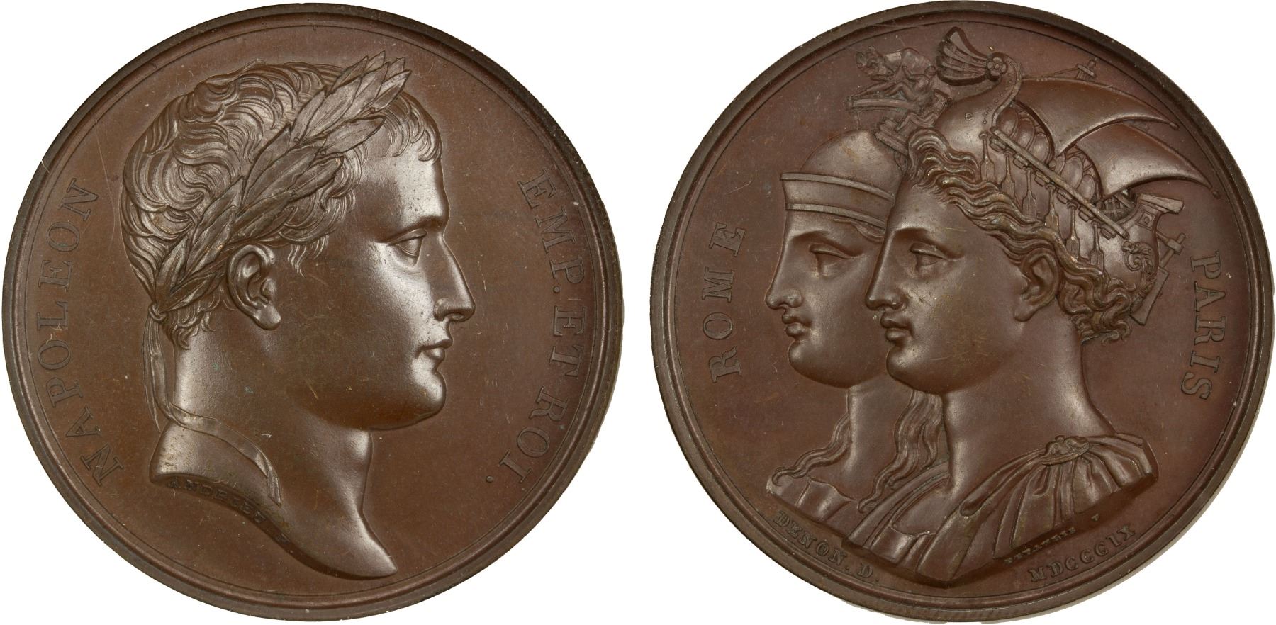 FRANCE: Napoleon I, Emperor, 1804-1814, AE medal, 1809, Bramsen-849, 40mm bronze medal by Andrieu and Depaulis, mintmaster Denon, commemorating the Annexation of Rome to France; NAPOLEON EMP ET ROI, laureate head to right; ANDRIEU F. on neck truncation // ROME / PARIS, jugate busts of Rome, draped and wearing helmet surmounted by wolf suckling twins, and Paris, draped and wearing galley-shaped headdress; DEPAULIS F. on bust truncation of Paris, DENON. D. MDCCCIX below, a lovely mint state example! NGC graded MS63 BN.