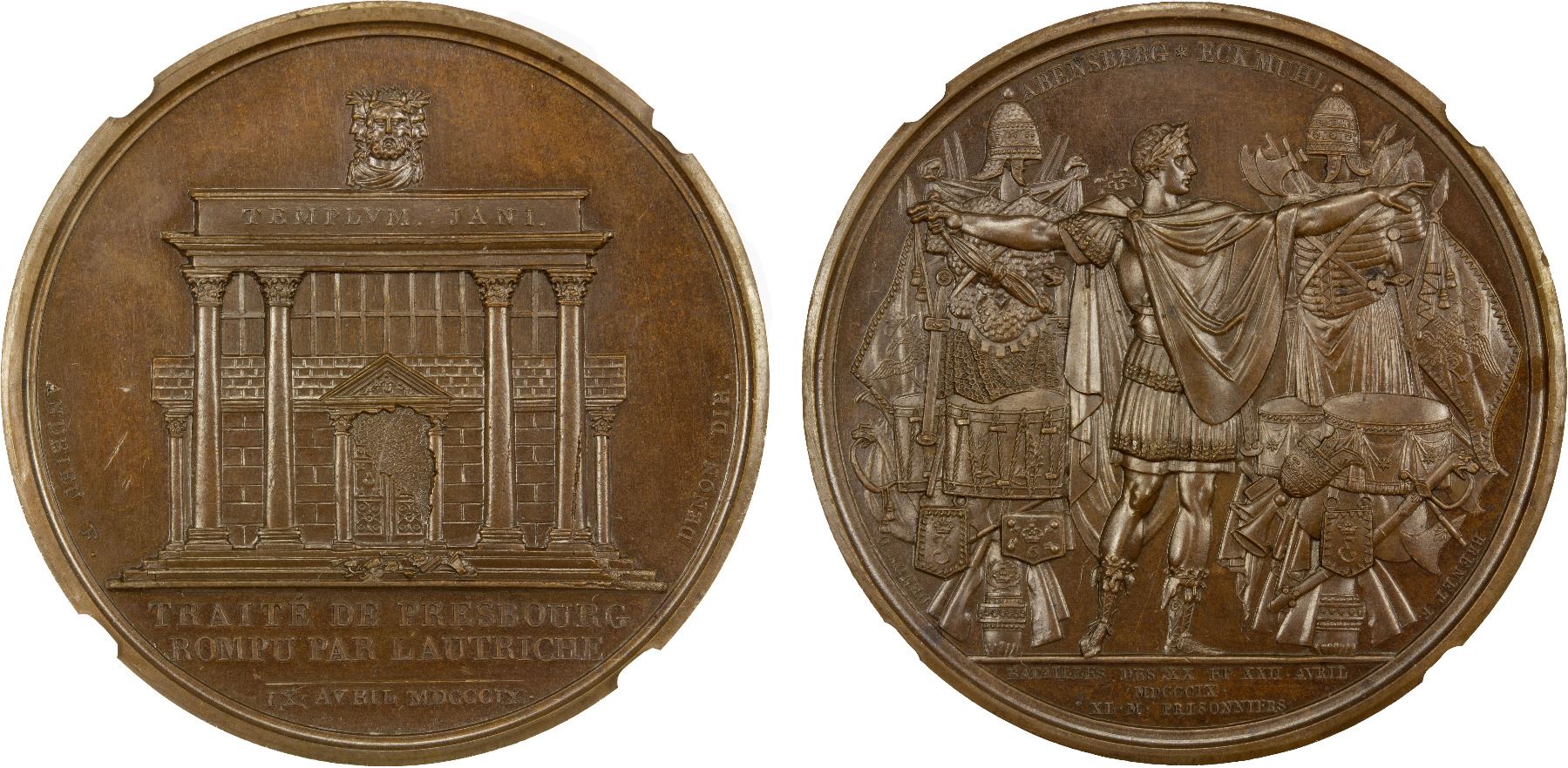 FRANCE: Napoleon I, Emperor, 1804-1814, AE medal, 1809, Bramsen-844, 40mm bronze medal by Andrieu and Brenet, mintmaster Denon, commemorating Austria's Violation of the Treaty of Pressburg and the Battles of Abensberg and Eckmühl; tetrastyle temple with TEMPLVM JANI on architrave, triple-faced head of Janus atop, doors broken; TRAITÉ DE PRESBOURG / ROMPU PAR L'AUTRICHE in two lines in exergue, IX AVRIL MDCCCIX. below, ANDRIEU F. to left, DENON DIR. to right // Napoléon standing facing, head to right, arms outstretched, before two large piles of arms and armor; ABENSBURG / ECKMUHL above, BATAILLES DES XX ET XXII AVRIL / MDCCCIX / XL. M PRISONNIERS in three lines in exergue, DENON D to lower left, BRENET F to lower right, a superb mint state example! NGC graded MS65 BN.