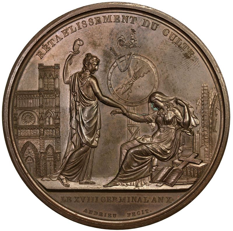 FRANCE: Napoleon I, First Consul, 1799-1804, AE medal (64.42g), AN 10 (1802), Bramsen-213, Ess-981, 51mm, medal for the restoration of Worship by Andrieu, bust left with NAPOLEON BONAPARTE PREMIER CONSUL around and ANDRIEU FECIT in small letters on truncation / France, standing with the mirror of Prudence, reaches out to the afflicted Religion, who is seated near church ruins, with Notre Dame de Paris to left, with RÉTABLISSEMENT DU CULTE. at top and LE XVIII GERMINAL AN X. and ANDRIEU FECIT (in small letters) in exergue, Choice About Unc. The Concordant between France and the court of Rome was sanctioned April 8, 1802 (18 Germinal). Photo size reduced.