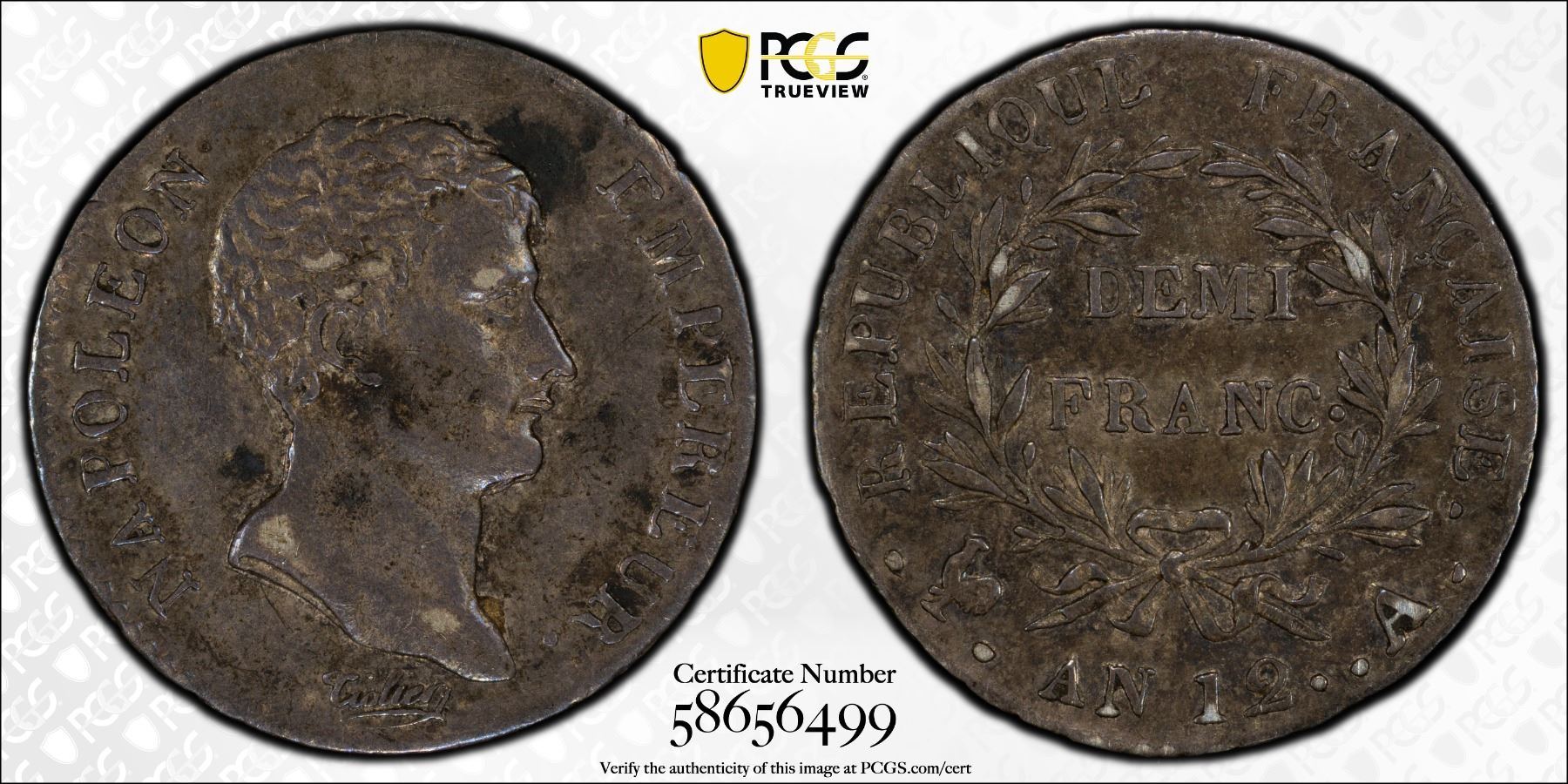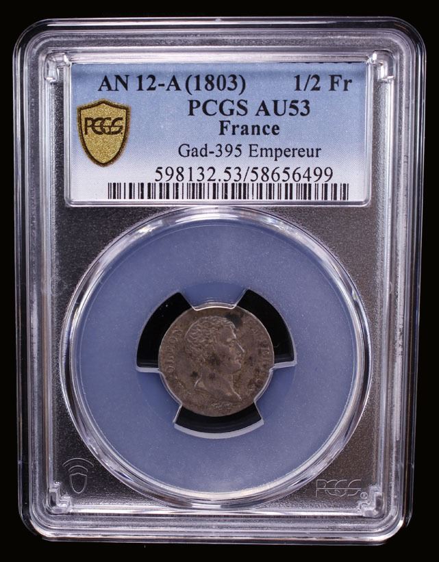 FRANCE: Napoleon I, First Consul, 1799-1804, AR 1/2 franc, AN12-A (1803), KM-655.1, Gad-395, F-174-4, an attractive toned example, PCGS graded AU53.