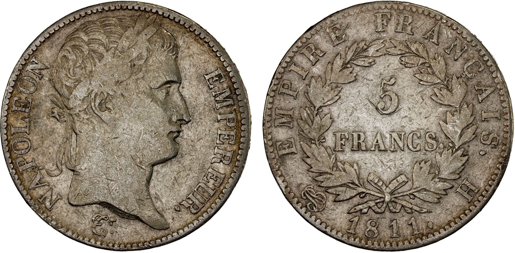 FRANCE: Napoleon I, as Emperor, 1804-1814, 1815, AR 5 francs, La Rochelle, 1811-H, KM-694.6, F-VF, ex Dr. Vincent John Adams Flynn Collection.
