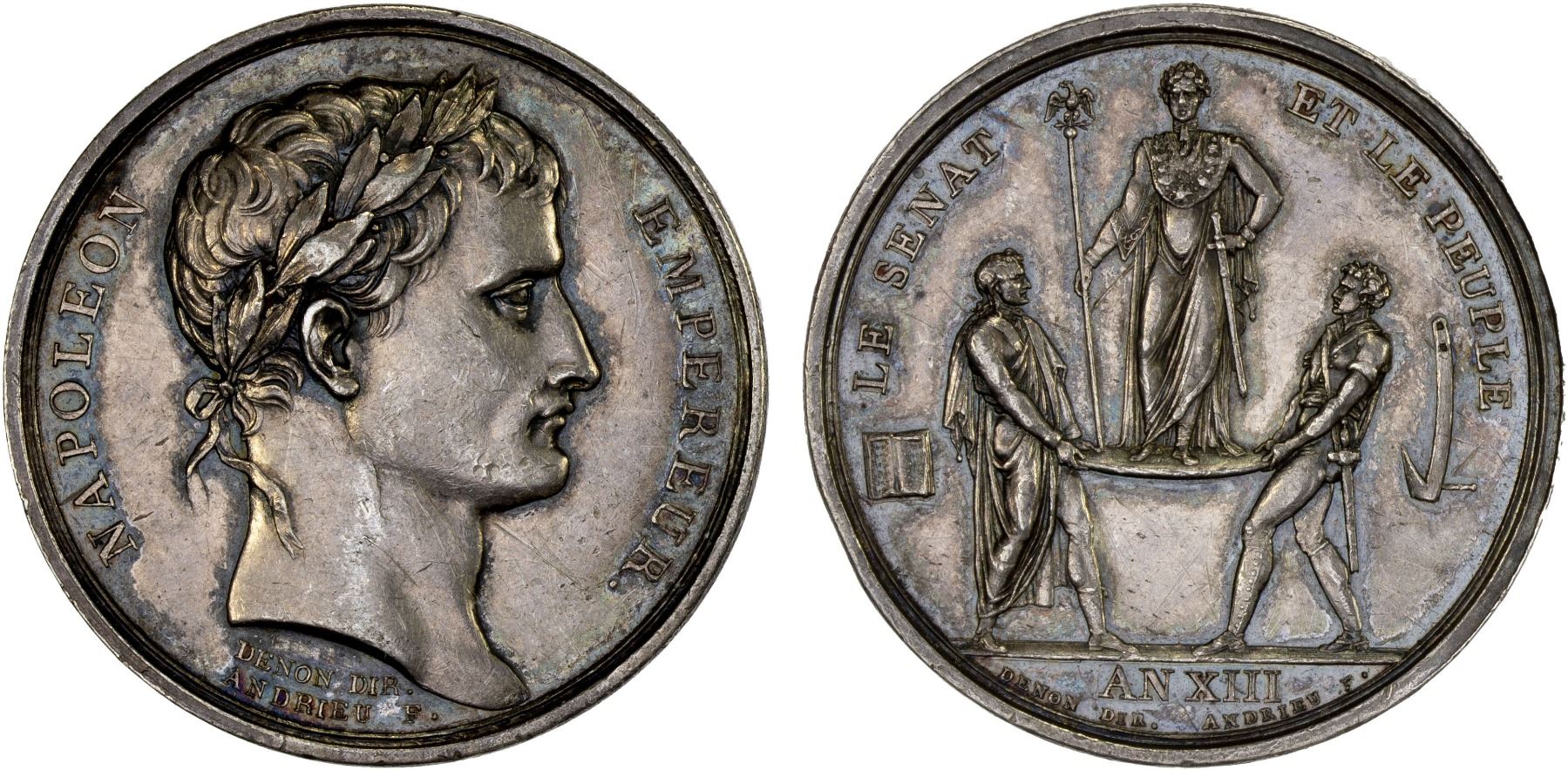 FRANCE: Napoleon I, as Emperor, 1804-1814, 1815, AR medal (15.61g), AN 13 (1804-5), Julius-1258, Bramsen-326, 32mm silver medal on the Coronation of the Emperor by Andrieu and Jeuffroy, laureate bust right with NAPOLEON - EMPEROR around // on a shield held by a senator and a soldier, the Emperor standing facing in coronation robes, holding a scepter adorned with an eagle, with tablets of the law to the left and a plow shank to the right with LE SENAT - ET LE PEUPLE around and AN XIII in exergue, lightly cleaned with numerous light scratches, starting to retone, plain edge, XF. The Coronation of Napoleon was the enthronement and coronation ceremony that followed the proclamation of Napoleon Bonaparte as Emperor of the French under the title of Napoleon I on May 18, 1804. The religious coronation ceremony, officiated by Pope Pius VII, followed by the coronation, took place on Sunday, December 2, 1804, at Notre-Dame de Paris. It lasted nearly five hours, and the painter Jacques-Louis David painted two paintings of it: The Coronation of Napoleon and The Distribution of the Eagles.