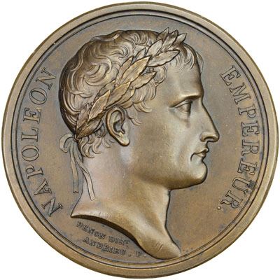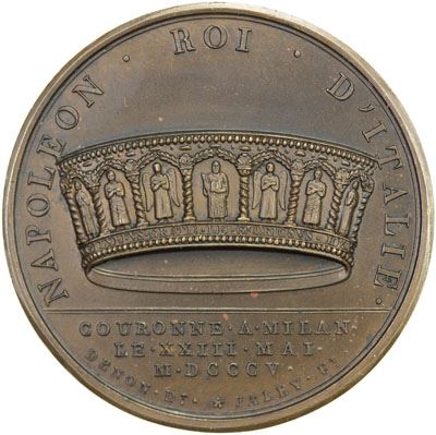 FRANCE: Napoleon I, as Emperor, 1804-1814, AE medal (44.57g), 1805, Br-418, 41mm, medal for the Milan Coronation of Napoleon, laureated bust of Napoleon right with NAPOLEON EMPEREUR. around and DENON DIRt ANDRIEU. F. in small letters below / iron crown of Lombardy with angels and saints in the arches and AGILVLFVS.GRATIA.DEI.GLORIOSVS.REX. on lower band and NAPOLEON. ROI. D'ITALIE. around and COURONNE.A.MILAN.LE.XXIII.MAI.M.DCCCV. in exergue and DENON.Dt. * JALEY. Ft at bottom along rim, restrike, shows the slightest of wear, Choice About Unc.
